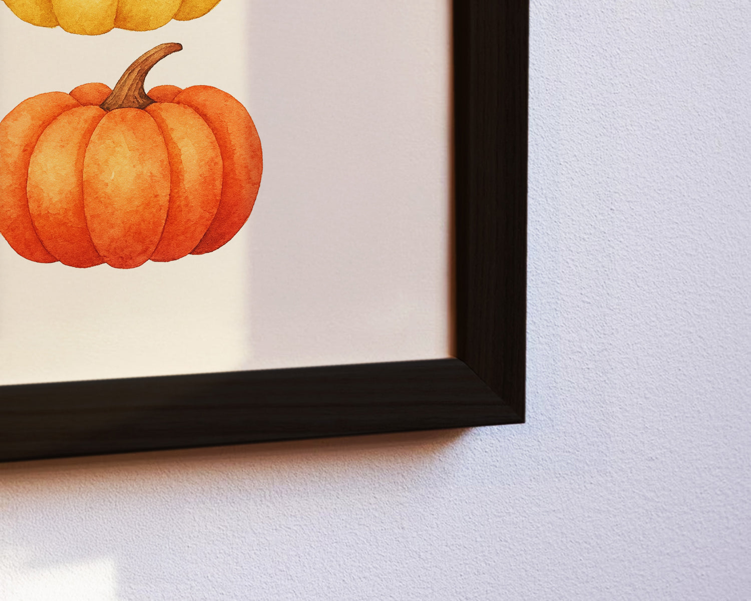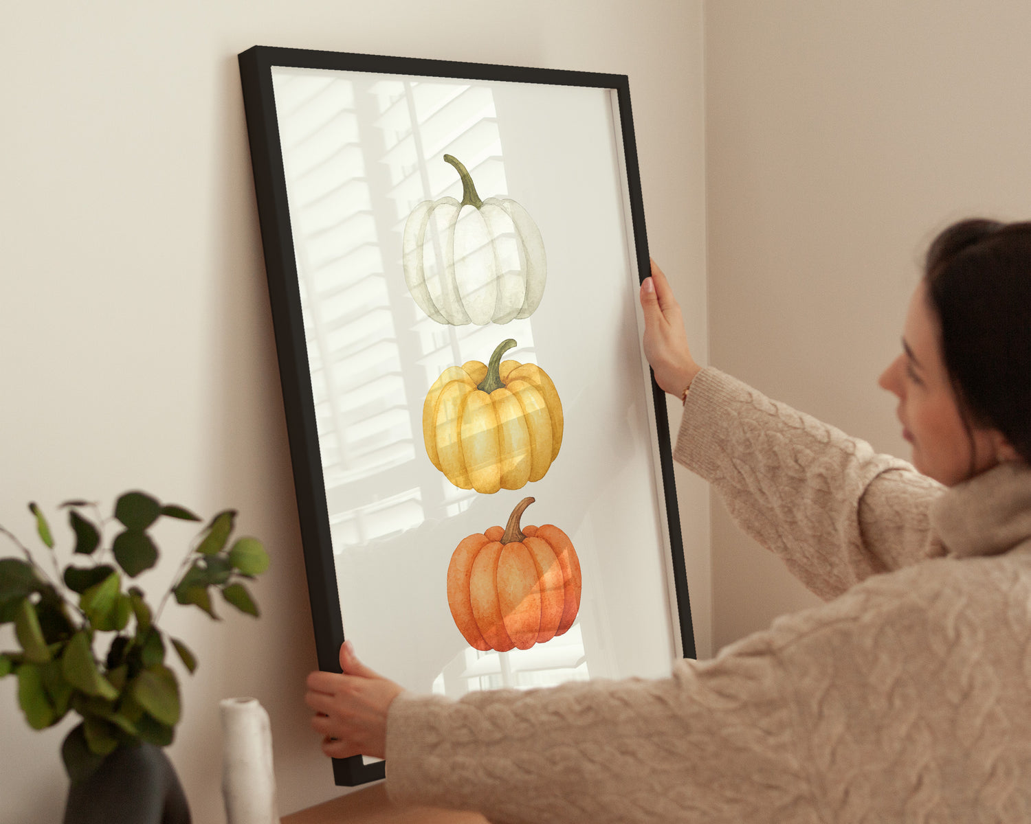 Ein Poster mit drei Aquarell-Kürbissen in Weiß, Gelb und Orange. Das sanfte, verspielte Motiv bringt herbstliche Stimmung in deine Einrichtung und harmoniert besonders gut mit modernen und minimalistischen Wohnstilen.