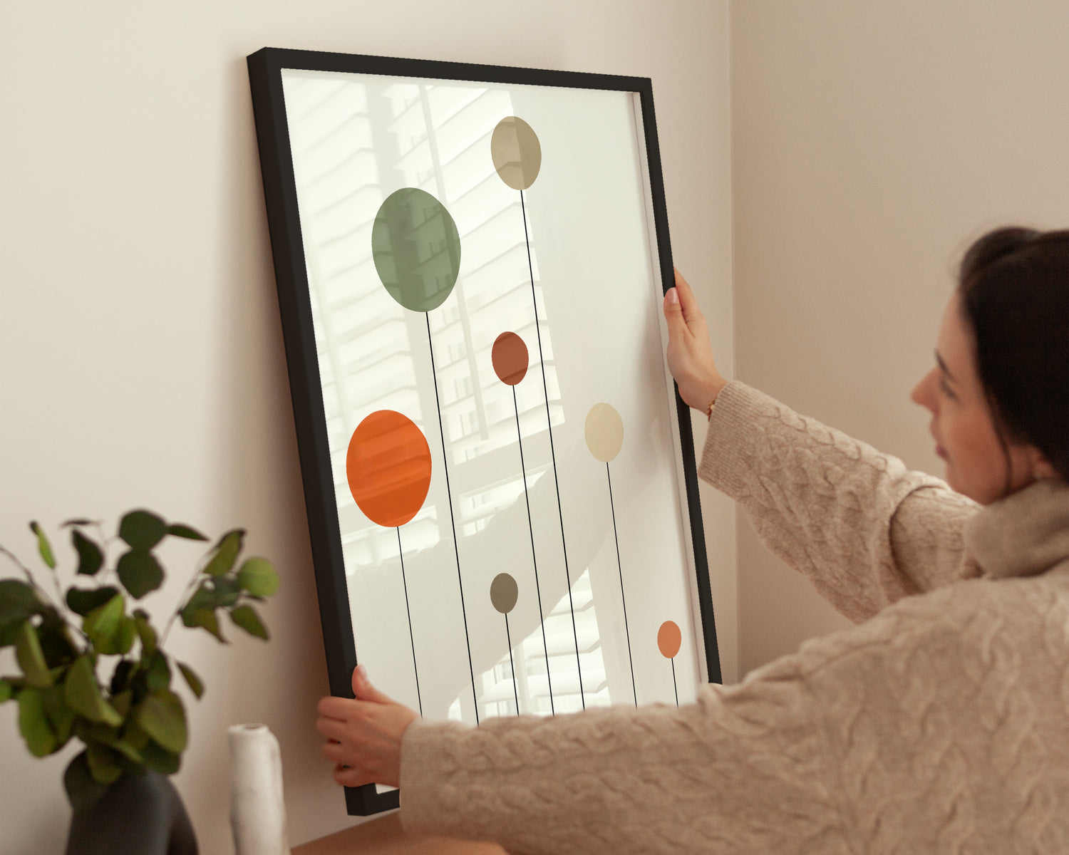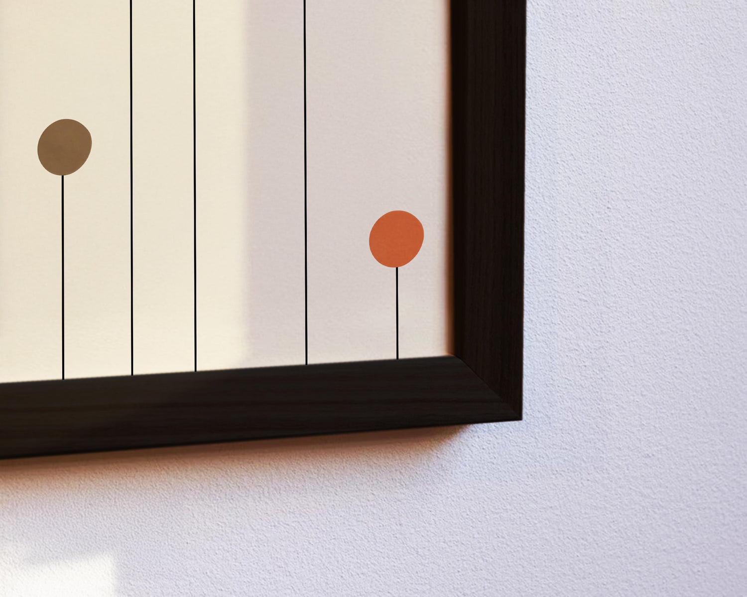 Schlicht und modern präsentiert sich dieses Poster mit verschiedenfarbigen Kreisen und feinen Linien auf hellem Hintergrund. Die natürlichen, warmen Farbtöne schaffen eine ruhige, ausgewogene Stimmung und harmonieren perfekt mit minimalistischen und skandinavischen Interieurs. Durch sein dezentes, aber ausdrucksstarkes Design eignet sich dieses Kunstwerk sowohl für private Wohnräume als auch für stilvolle Büros oder Ateliers. Der hochwertige Druck bringt die sanften Farbübergänge klar zur Geltung und macht das Poster zu einem zeitlosen Dekorationsstück, das sich vielseitig kombinieren lässt.
