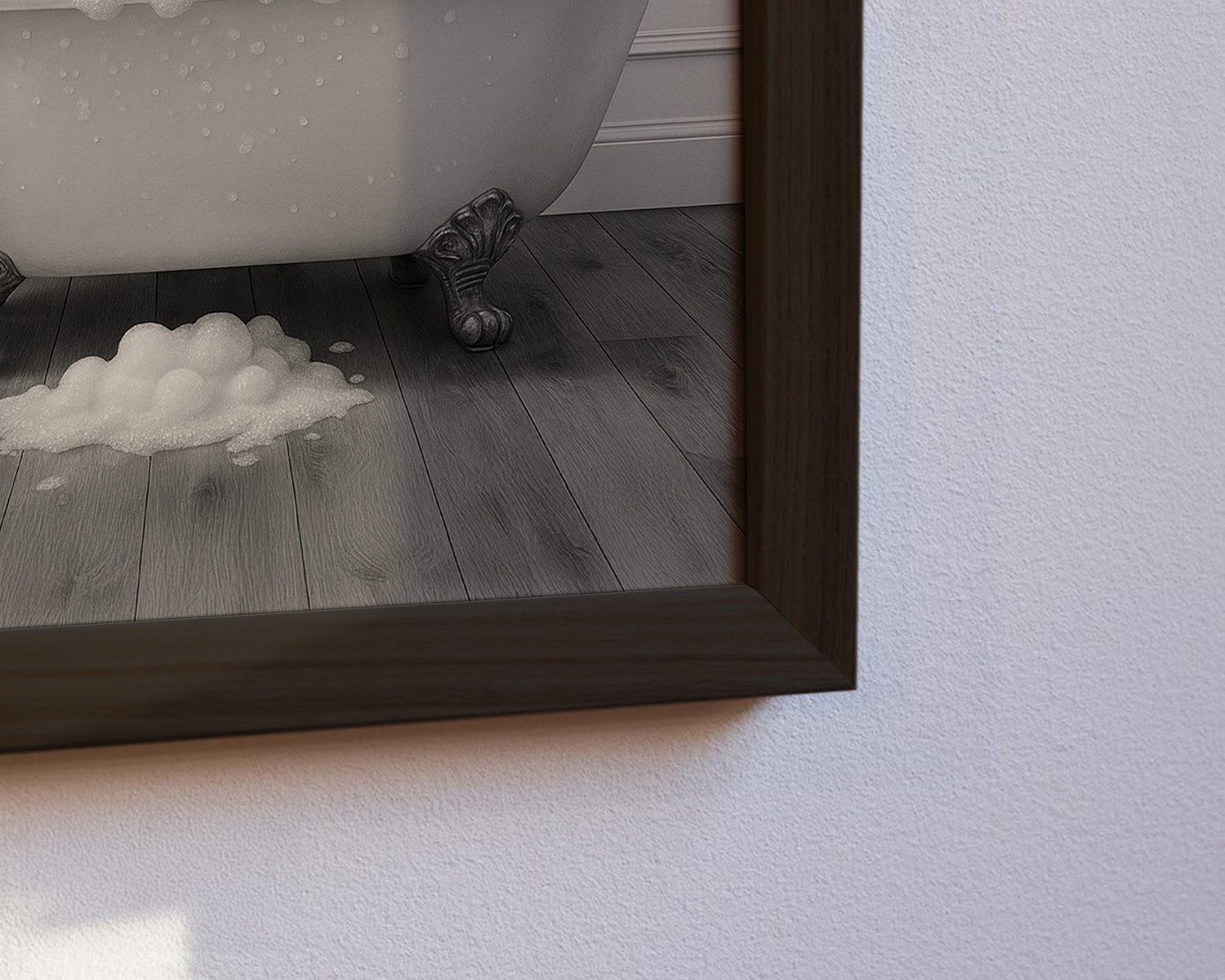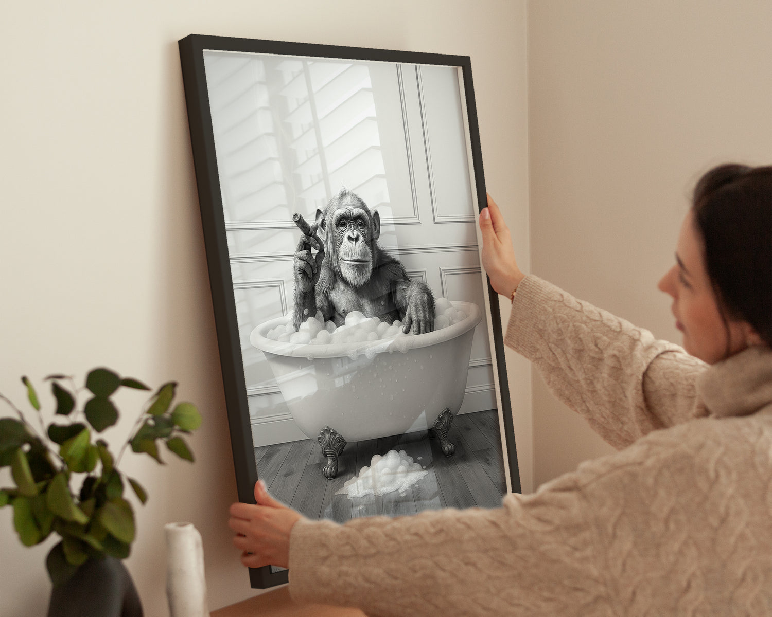Dieser witzige Kunstdruck zeigt einen gelassenen Affen, der in einer klassischen Badewanne voller Schaum sitzt und genüsslich eine Zigarre raucht. Perfekt als originelle Wanddekoration im Badezimmer oder Gäste-WC. Das Motiv sorgt garantiert für Schmunzeln und ist hochwertig gerahmt in Schwarz oder Weiß erhältlich. Bringe mit dieser modernen Kunst humorvolle Leichtigkeit in deine Räume.
