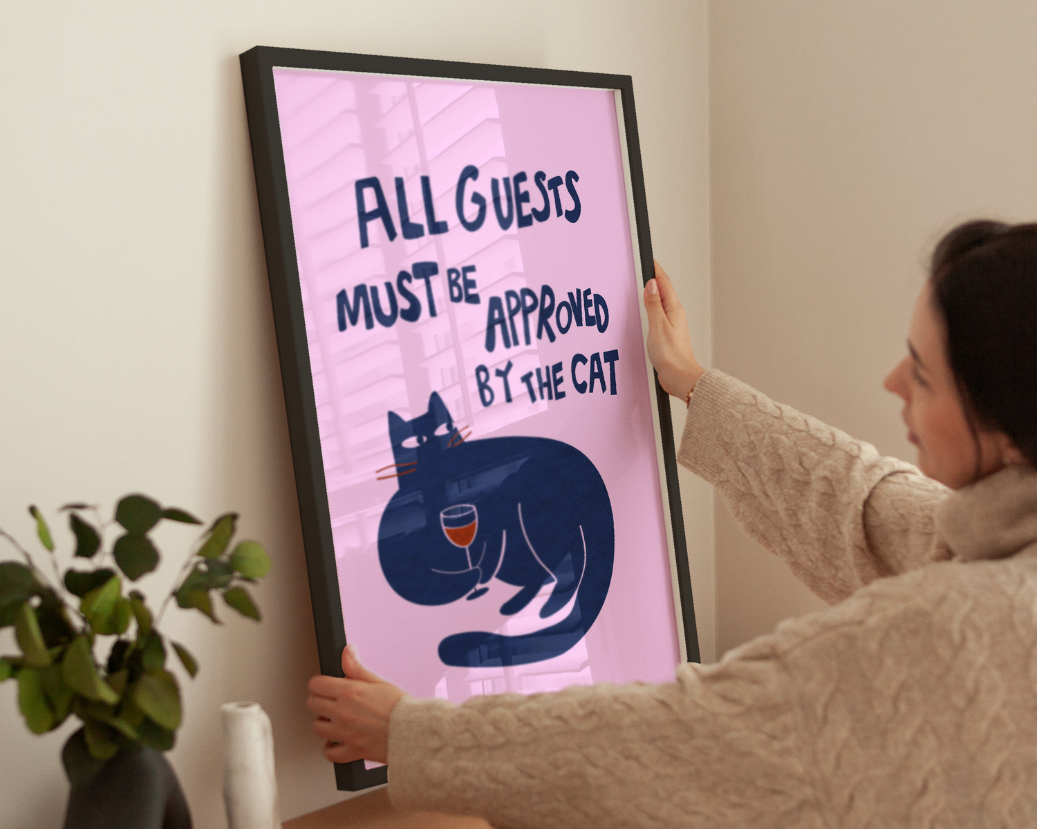Dieses humorvolle Poster zeigt eine minimalistisch illustrierte, dunkelblaue Katze mit einem Glas Rotwein, die skeptisch nach rechts blickt. Darüber steht in verspielter, handgeschriebener Typografie der Satz „All guests must be approved by the cat“. Der Hintergrund ist ein freundliches Rosa, was das Motiv lebendig und modern wirken lässt. Diese Wandkunst ist die perfekte Wahl für Katzenliebhaber, die ihr Zuhause mit einem Augenzwinkern dekorieren möchten – egal ob im Wohnzimmer, Flur oder in der Küche. Das Poster sorgt garantiert für Schmunzeln und Gesprächsstoff bei deinen Gästen.