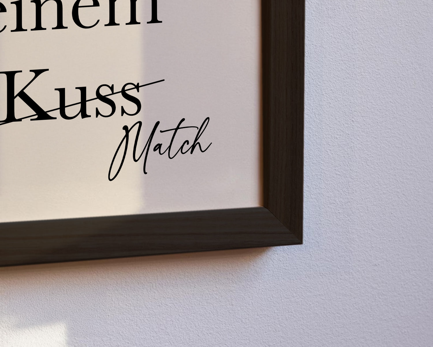 Dieses Poster bringt mit dem Spruch „Alles beginnt mit einem Match“ modernen Humor an deine Wand. Der minimalistische Schwarz-Weiß-Stil passt perfekt in Wohnzimmer, Schlafzimmer oder Flur und macht das Bild zu einem idealen Geschenk für Paare, die ihre Geschichte mit einem kleinen Swipe begonnen haben. Die hochwertige Typografie und der feine Druck sorgen dafür, dass der Schriftzug klar und edel wirkt, während die durchgestrichene Anspielung auf den Kuss dem Motiv einen witzigen Twist gibt.