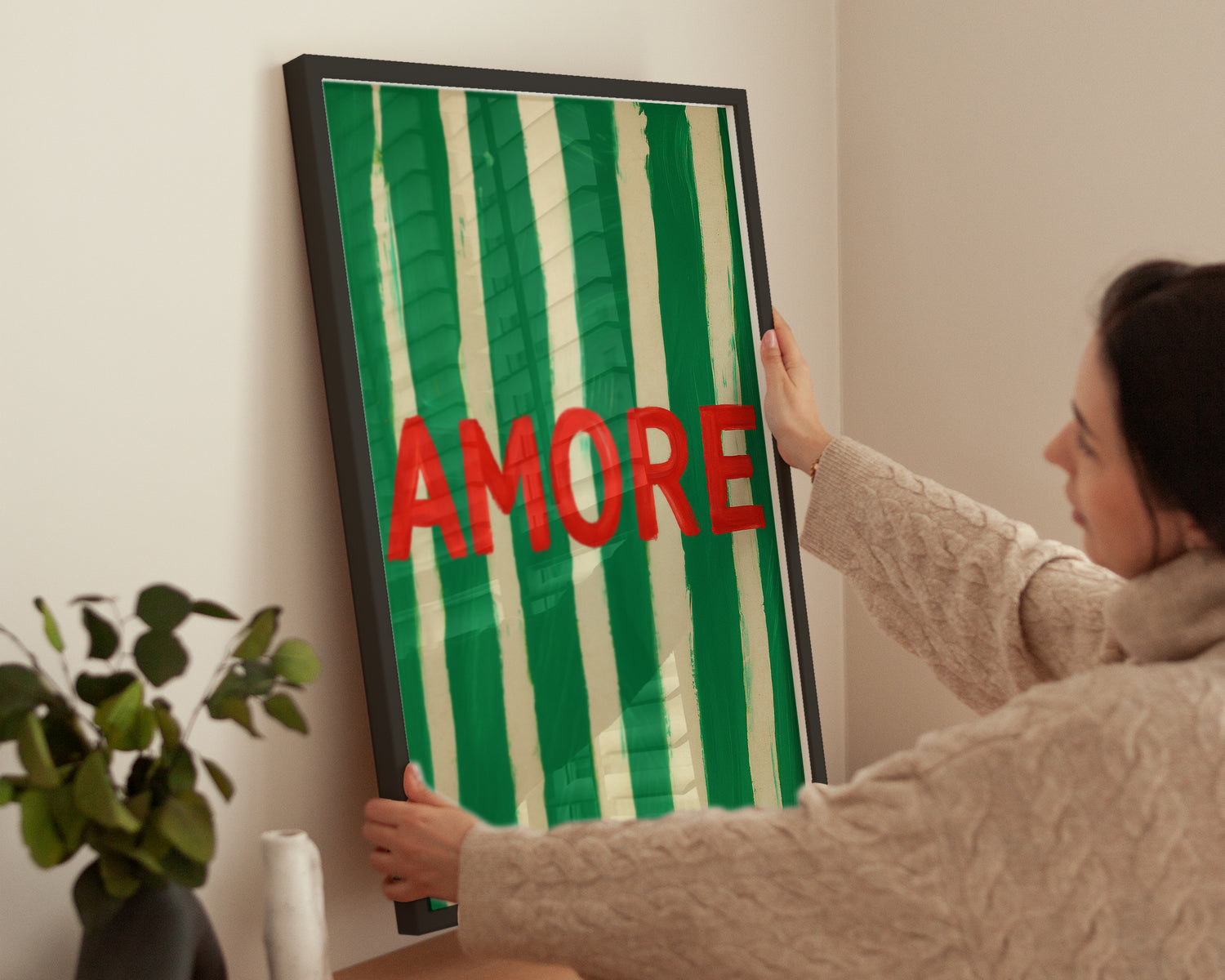 Dieses moderne Typografie Poster zeigt den roten Schriftzug „AMORE“ auf einem stilvollen grün-weiß gestreiften Hintergrund. Der Kunstdruck setzt ein klares Statement für Liebe und mediterranes Lebensgefühl und ist als hochwertige Wanddekoration perfekt geeignet fürs Wohnzimmer, Schlafzimmer oder Büro. Wähle zwischen schwarzem oder weißem Rahmen und bringe mit dieser Wandkunst Farbe und Lebensfreude in deine Räume.