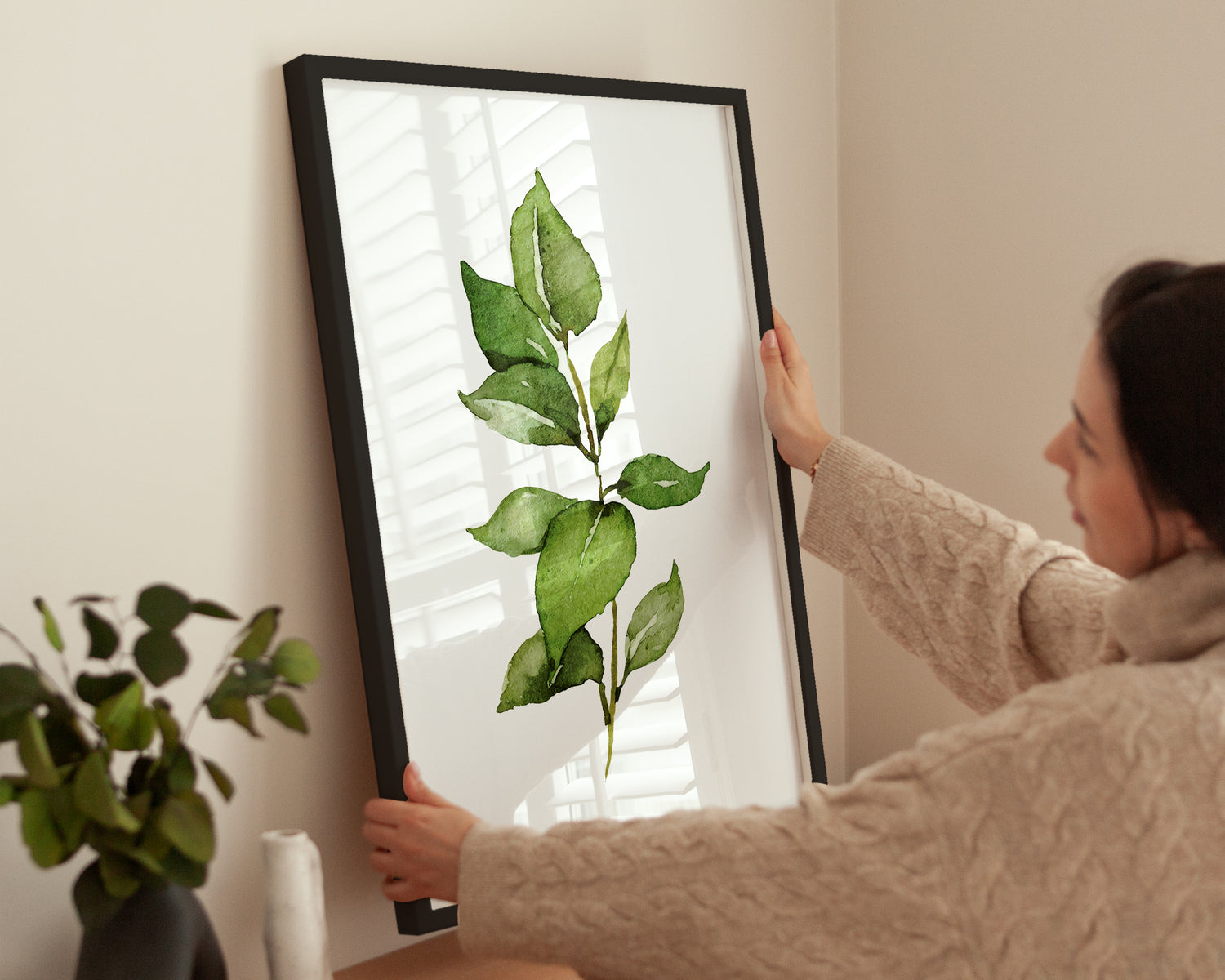 Die feinen Farbschattierungen der Blätter verleihen dem Motiv eine beruhigende, natürliche Ausstrahlung. Der weiße Hintergrund hebt die frischen Grüntöne hervor und schafft einen minimalistischen Look. Dieses Poster fügt sich harmonisch in verschiedene Einrichtungsstile ein und bringt einen lebendigen botanischen Akzent an jede Wand.