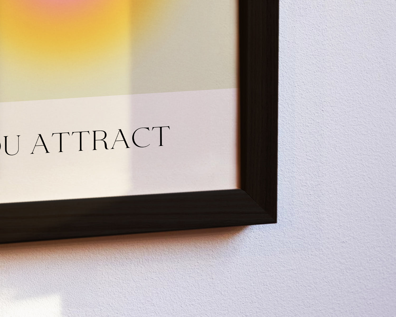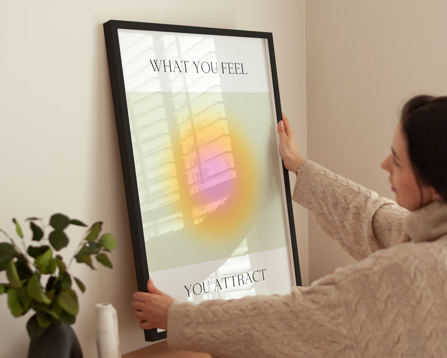 Das Poster What You Feel You Attract verbindet visuelle Sanftheit mit positiver Botschaft. Der Farbverlauf aus Gelb und Rosa strahlt Leichtigkeit aus, während die Typografie zum achtsamen Denken anregt. Ideal als Inspiration im Wohnbereich, Büro oder Meditationsraum.
