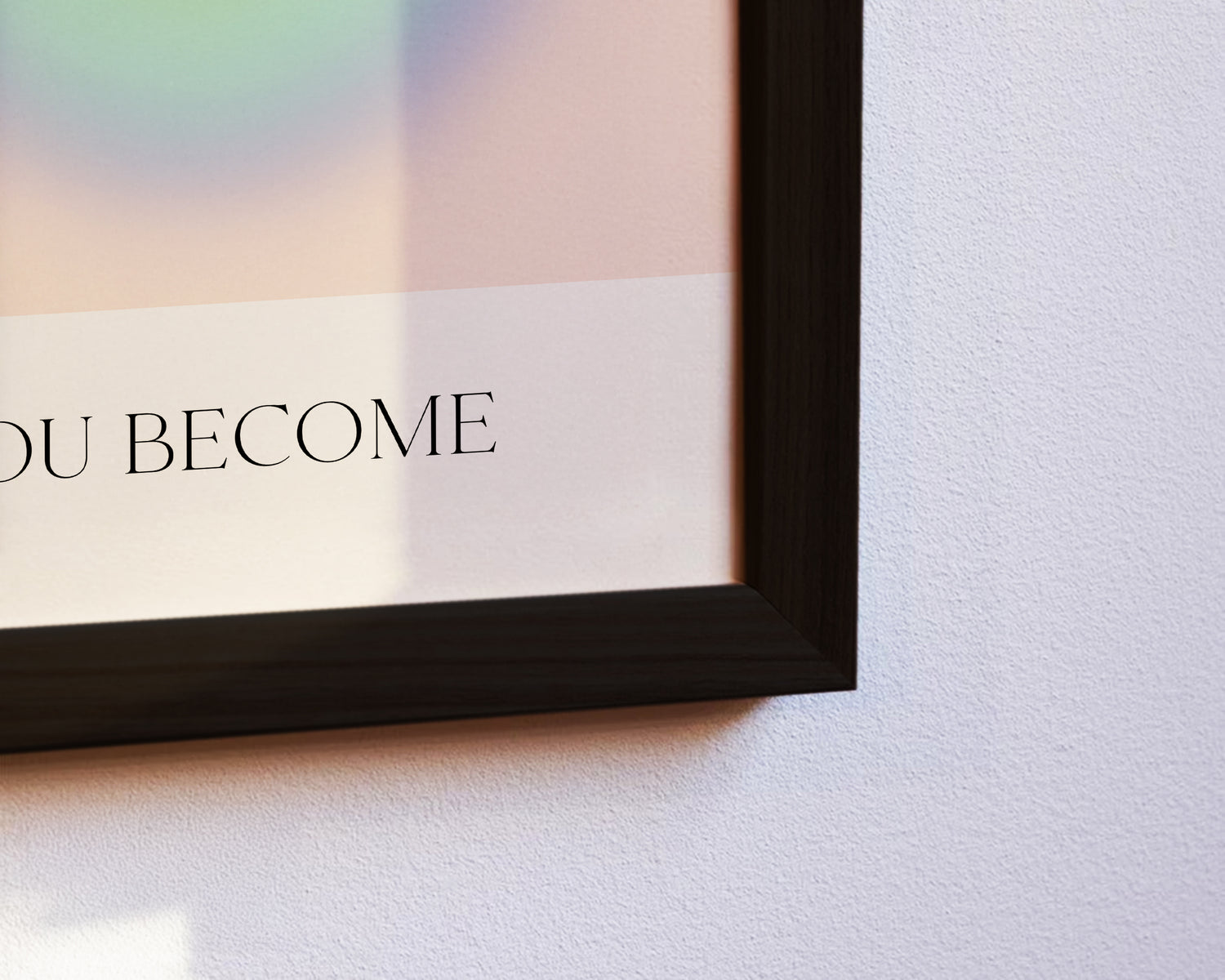 Ein weicher Verlauf in Blau und Grün bildet den Mittelpunkt dieses Posters, eingerahmt von der Botschaft What You Imagine You Become. Die Farbgestaltung wirkt beruhigend und zukunftsorientiert – ideal für kreative Räume, Home Offices oder Orte des Rückzugs.