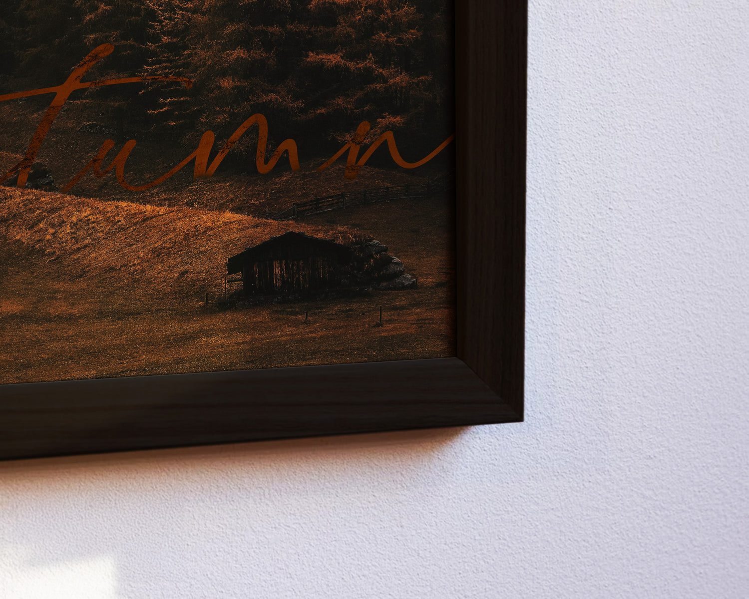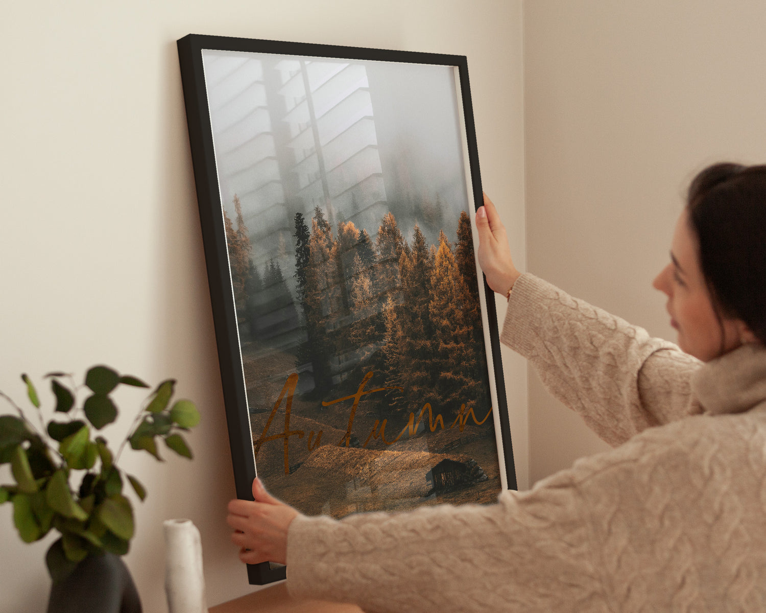 Stimmungsvolles Poster mit einem nebelverhangenen Wald in warmen Herbstfarben. Die geheimnisvolle Atmosphäre lädt zum Träumen ein und schafft eine perfekte Balance zwischen Ruhe und Naturverbundenheit.