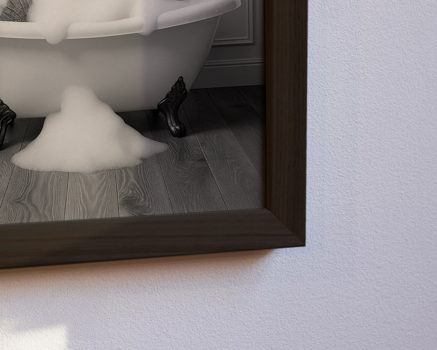 Ein humorvolles Schwarz-Weiß-Motiv, das einen Elefanten zeigt, der genüsslich in einer altmodischen Badewanne voller Schaum sitzt und Wasser mit dem Rüssel hochspritzt. Dieses originelle Poster bringt verspielten Charme ins Badezimmer, Gäste-WC oder sogar ins Wohnzimmer und sorgt garantiert für gute Laune bei jedem Blick.