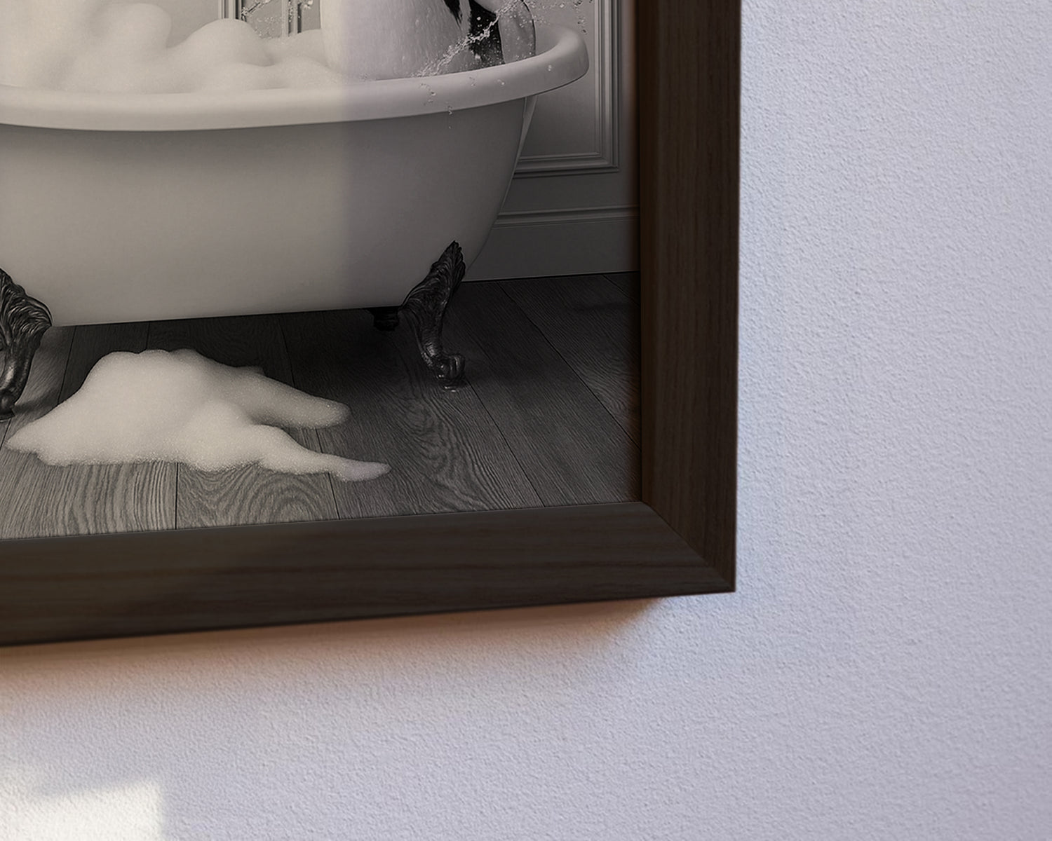 Ein schwarz-weiß Poster das zwei Pinguine zeigt, die sich in einer alten Badewanne voller Schaum amüsieren. Während einer der Pinguine springend ins Wasser taucht, sitzt der andere bereits entspannt im Schaum. Dieses humorvolle Wandbild bringt tierischen Spaß ins Badezimmer, Gäste-WC oder jeden anderen Raum und ist ein echter Blickfang für Tier- und Kunstliebhaber.