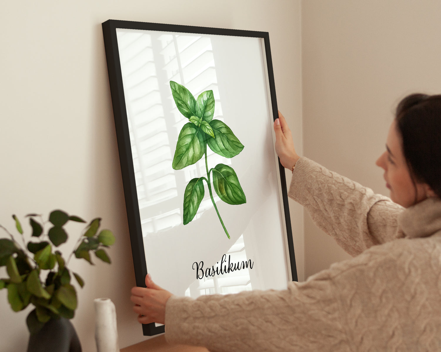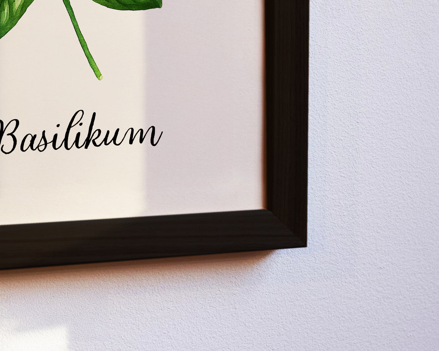 Das Poster zeigt einen zarten Basilikumzweig in realistischer Aquarellmalerei auf weißem Hintergrund. Die Blätter schimmern in lebendigen Grüntönen und vermitteln Frische und Natürlichkeit. Ideal für alle, die Kräuterliebe und minimalistisches Design kombinieren möchten. Die schlichte Darstellung fügt sich harmonisch in moderne und traditionelle Einrichtungsstile ein.