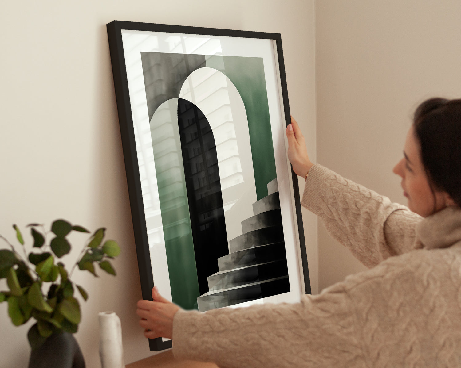 Bauhaus-inspiriertes Treppen-Design in Oliv, Weiß und Schwarz. Ideal für minimalistische, moderne Einrichtungsstile.