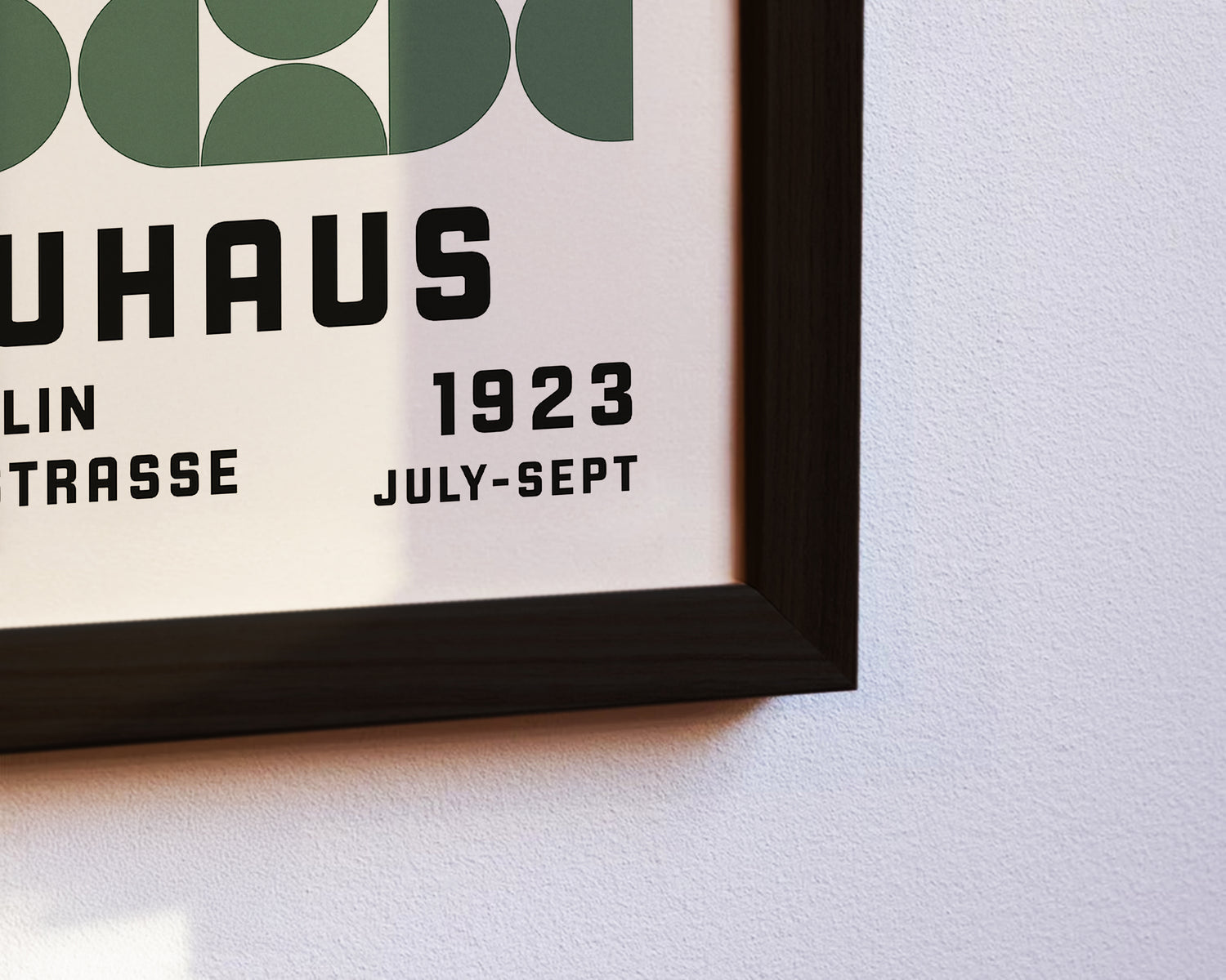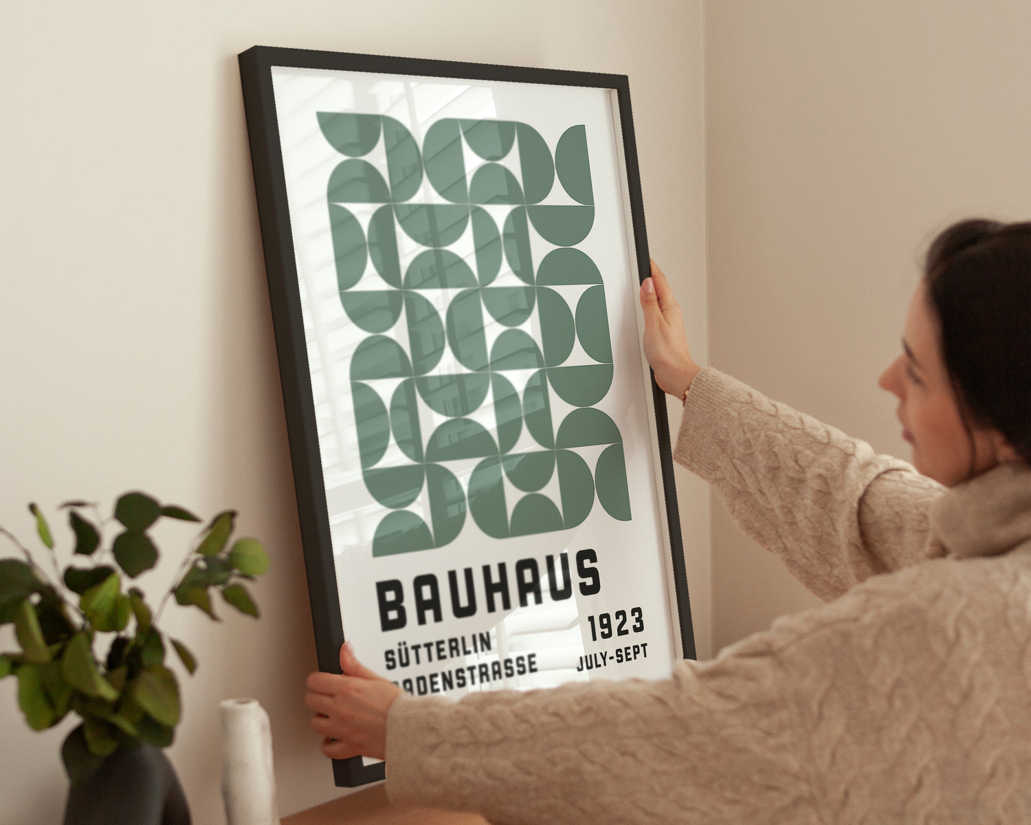 Dieser stilvolle Kunstdruck im Bauhaus-Stil zeigt ein geometrisches Muster in Grün kombiniert mit einer typischen Bauhaus Typografie. Ein minimalistisches Design, das Eleganz und moderne Kunst verbindet und sich ideal als Wanddekoration im Wohnzimmer, Arbeitszimmer oder Flur eignet. Der hochwertige Druck ist in schwarzem oder weißem Rahmen erhältlich und bringt zeitlosen Bauhaus-Charme in dein Zuhause.