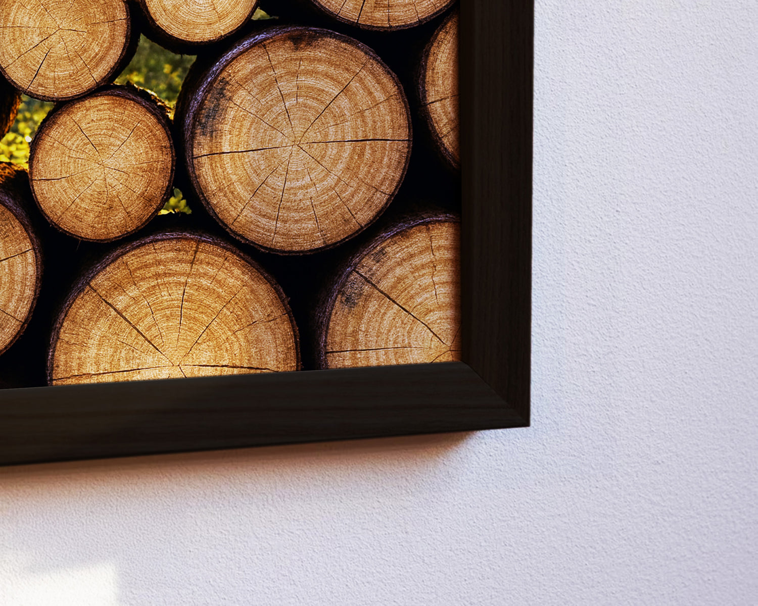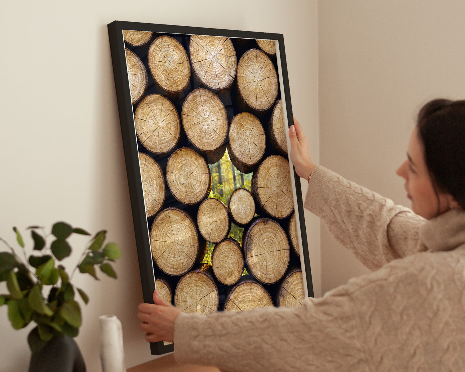Poster mit gestapelten Baumstämmen, durch die sich herbstliches Licht im Hintergrund abzeichnet. Ein warmes, natürliches Motiv für gemütliche Wohnräume.