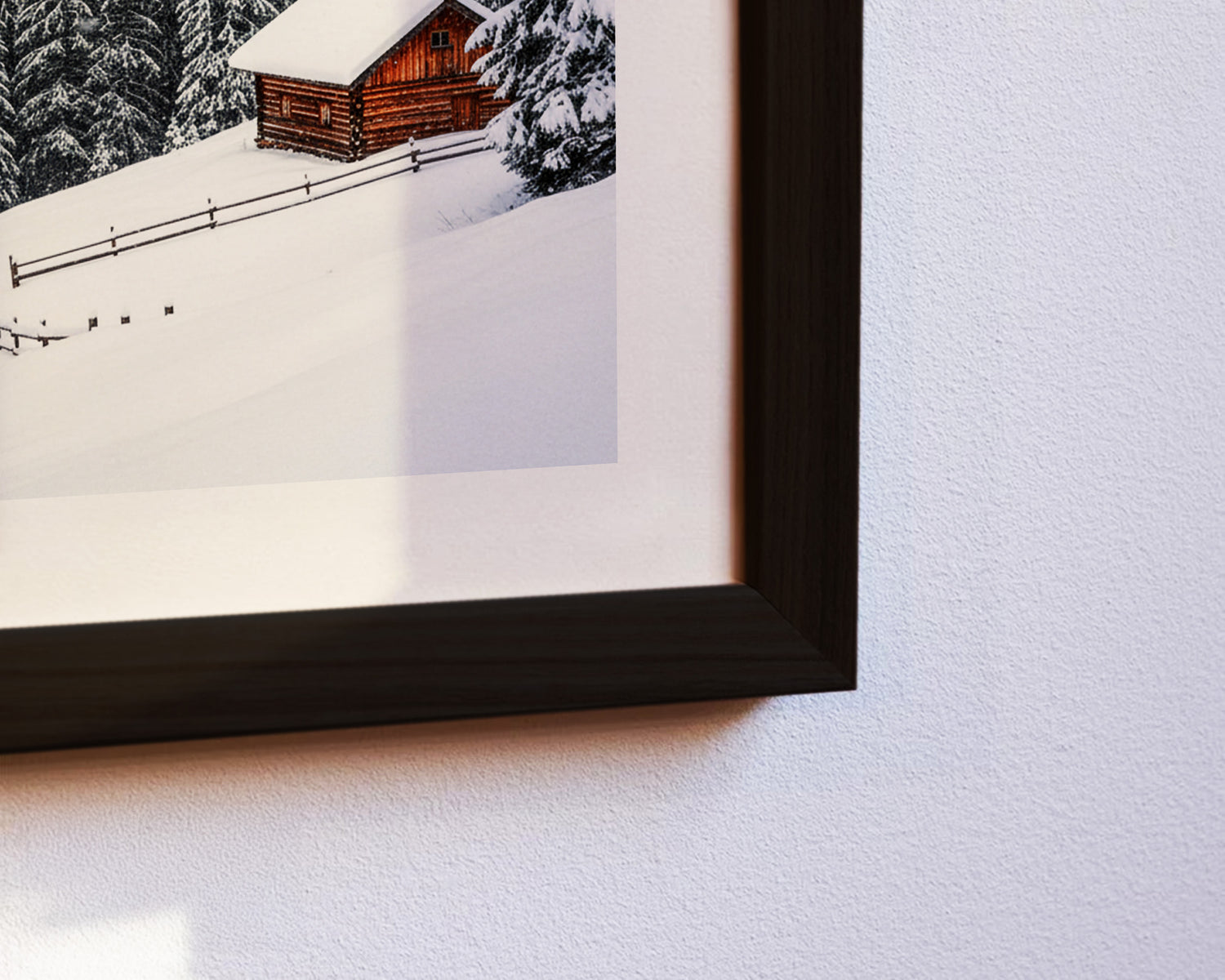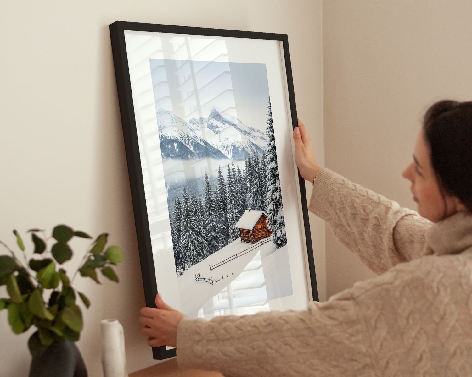 Stimmungsvolles Poster mit einer verschneiten Berghütte, umgeben von majestätischen Tannen und hohen Bergen. Das Motiv vermittelt Ruhe, Geborgenheit und die Schönheit eines Winterparadieses.