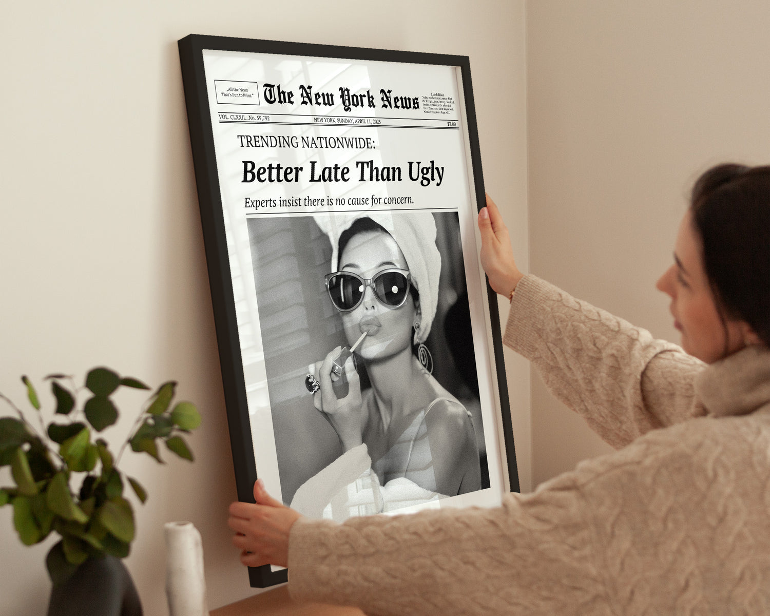 Zeitungs-Poster in Schwarz-Weiß mit glamourösem Motiv: Frau im Handtuch-Turban trägt Lippenstift auf. Der Spruch Better Late Than Ugly setzt eine klare Botschaft. Perfektes Statement-Piece für Schlafzimmer, Bad oder Ankleidezimmer.