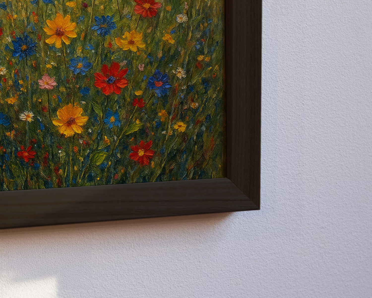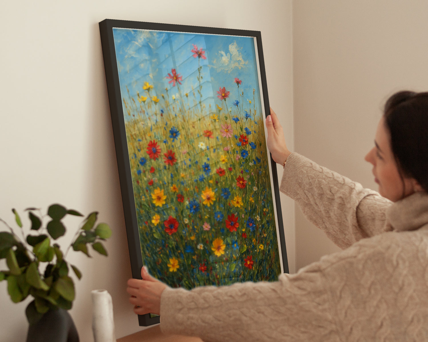 Dieses farbenfrohe Kunstposter zeigt eine lebendige Blumenwiese unter strahlend blauem Himmel in detailreicher Ölmalerei. Das Motiv vereint Sommer, Natur und Lebensfreude und eignet sich perfekt als Wanddekoration für Wohnzimmer, Schlafzimmer oder Flur. Der hochwertige Druck ist in schwarzem oder weißem Rahmen erhältlich und bringt frische Farben und ein Gefühl von Freiheit in dein Zuhause.