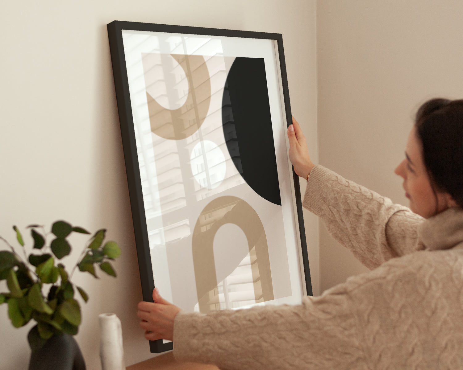 Dieses abstrakte Poster zeigt große geometrische Formen in Beige, Weiß und Schwarz, die im minimalistischen Design harmonisch zusammenspielen. Perfekt geeignet als Wanddekoration im Wohnzimmer, Schlafzimmer oder Büro. Der hochwertige Kunstdruck ist in einem schwarzen oder weißen Rahmen erhältlich und bringt moderne Eleganz und klare Linien in dein Zuhause.