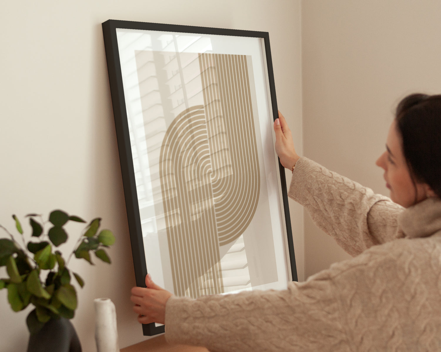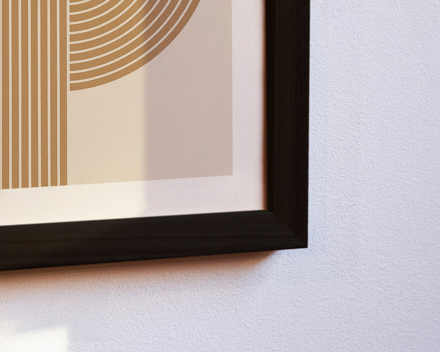 Dieses minimalistische Kunstposter zeigt ein geometrisches Muster aus geteilten Linienbögen in Beige auf hellem Hintergrund. Das Design bringt klare Linien und dezente Eleganz in dein Zuhause und passt ideal ins Wohnzimmer, Schlafzimmer oder Büro. Der hochwertige Kunstdruck ist gerahmt in Schwarz oder Weiß erhältlich.