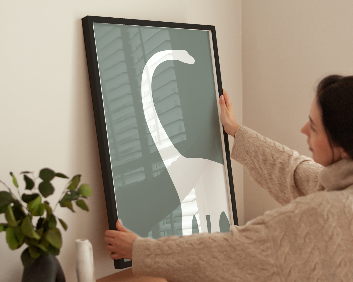 Dieses minimalistische Poster zeigt die weiße Silhouette eines Brachiosaurus mit langem Hals auf einem beruhigenden graugrünen Hintergrund. Die schlichte Darstellung bringt modernes Design ins Zuhause und ist ideal für alle, die Dinosaurier lieben oder auf klare, stilvolle Motive setzen.