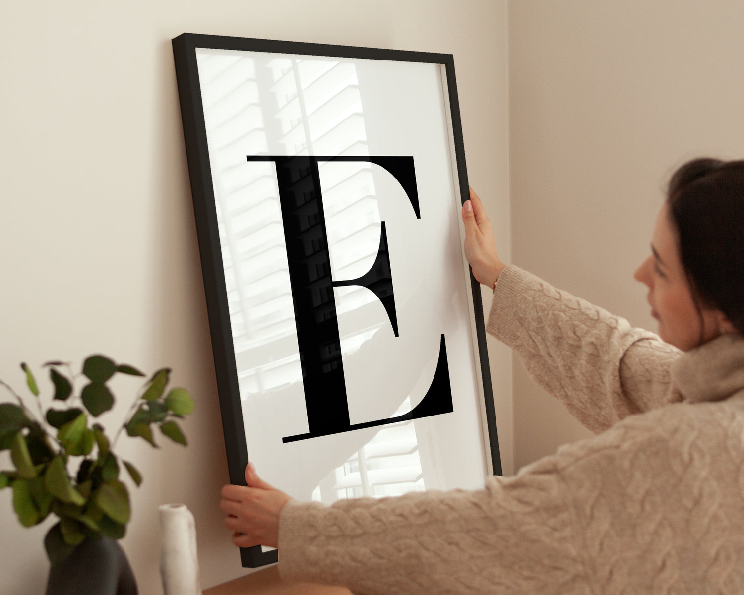 Modernes Poster mit dem Buchstaben „E“ in schwarzer Serifenschrift auf weißem Hintergrund. Minimalistisch und vielseitig kombinierbar – als Einzelstück oder im Set mit weiteren Buchstaben. Der Druck auf mattem Premium-Papier überzeugt durch klare Kanten, tiefes Schwarz und eine edle Ausstrahlung, die in Wohnzimmer, Schlafzimmer oder Büro gleichermaßen wirkt.