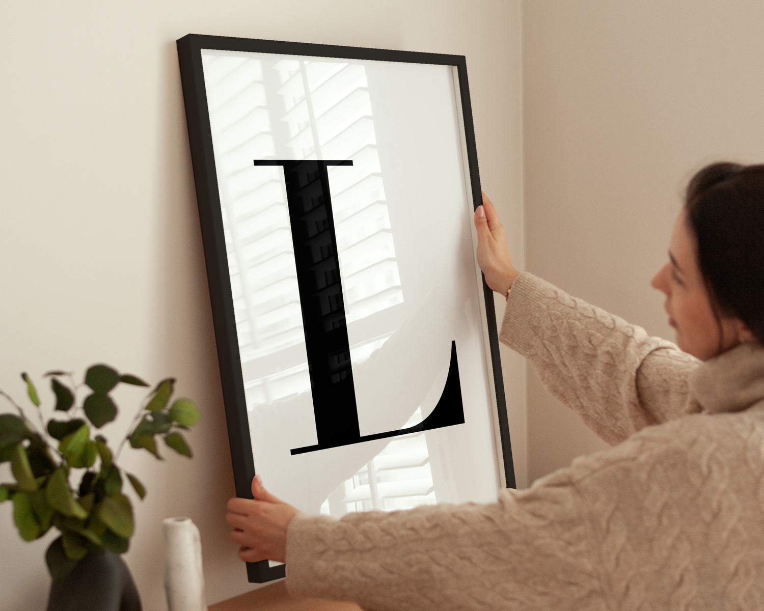 Modernes Typografie-Poster mit dem Buchstaben „L“ in schwarzer Serifenschrift auf weißem Hintergrund. Das minimalistische Design ist zeitlos, vielseitig kombinierbar und eignet sich sowohl als Einzelstück als auch in Kombination mit anderen Buchstabenpostern für personalisierte Wandgestaltungen. Gedruckt auf mattem Premium-Papier bietet es gestochen scharfe Linien und eine elegante, klare Wirkung für Wohn- und Arbeitsräume.