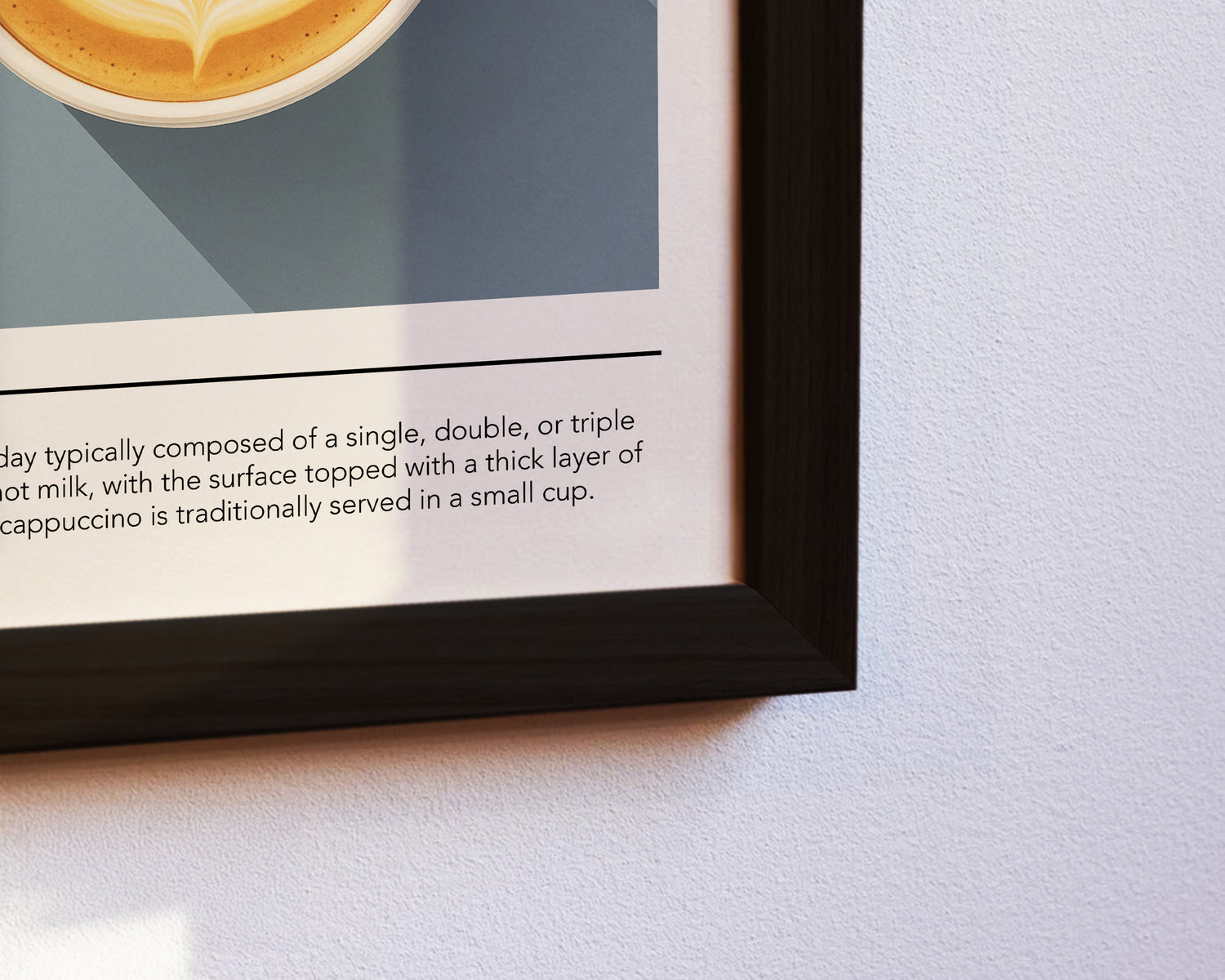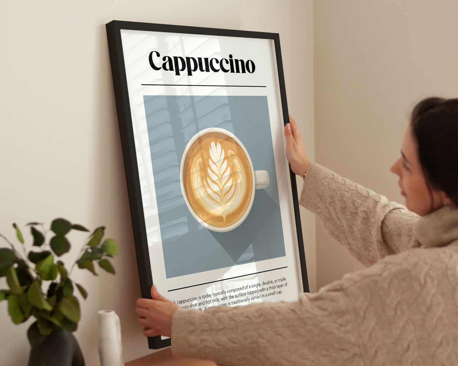 Dieses Poster bringt Latte Art und Hintergrundwissen zusammen. Die stilvolle Darstellung des Cappuccinos eignet sich perfekt für Barista-Ecken, Küchen oder Cafés mit Sinn für Ästhetik und Inhalt.
