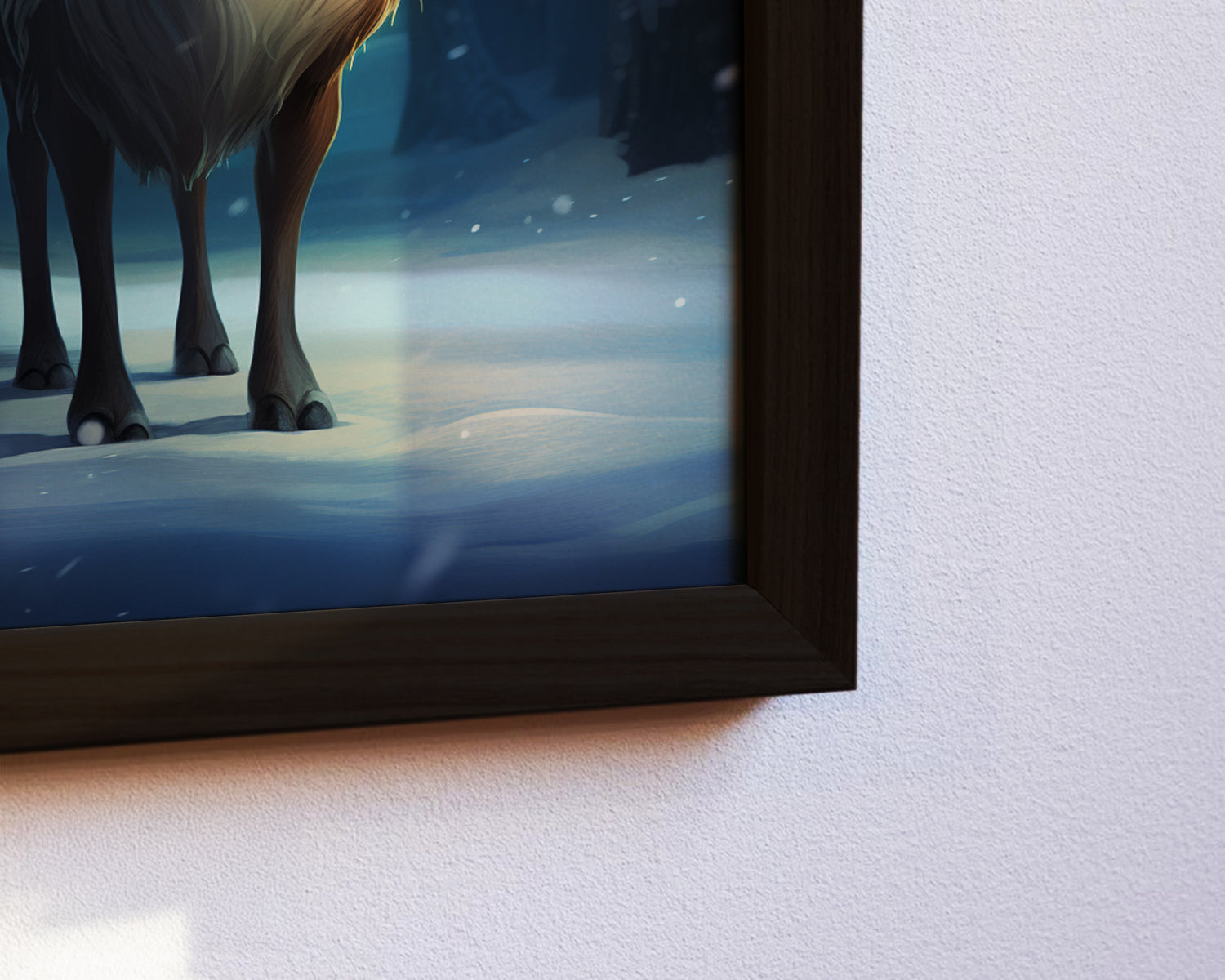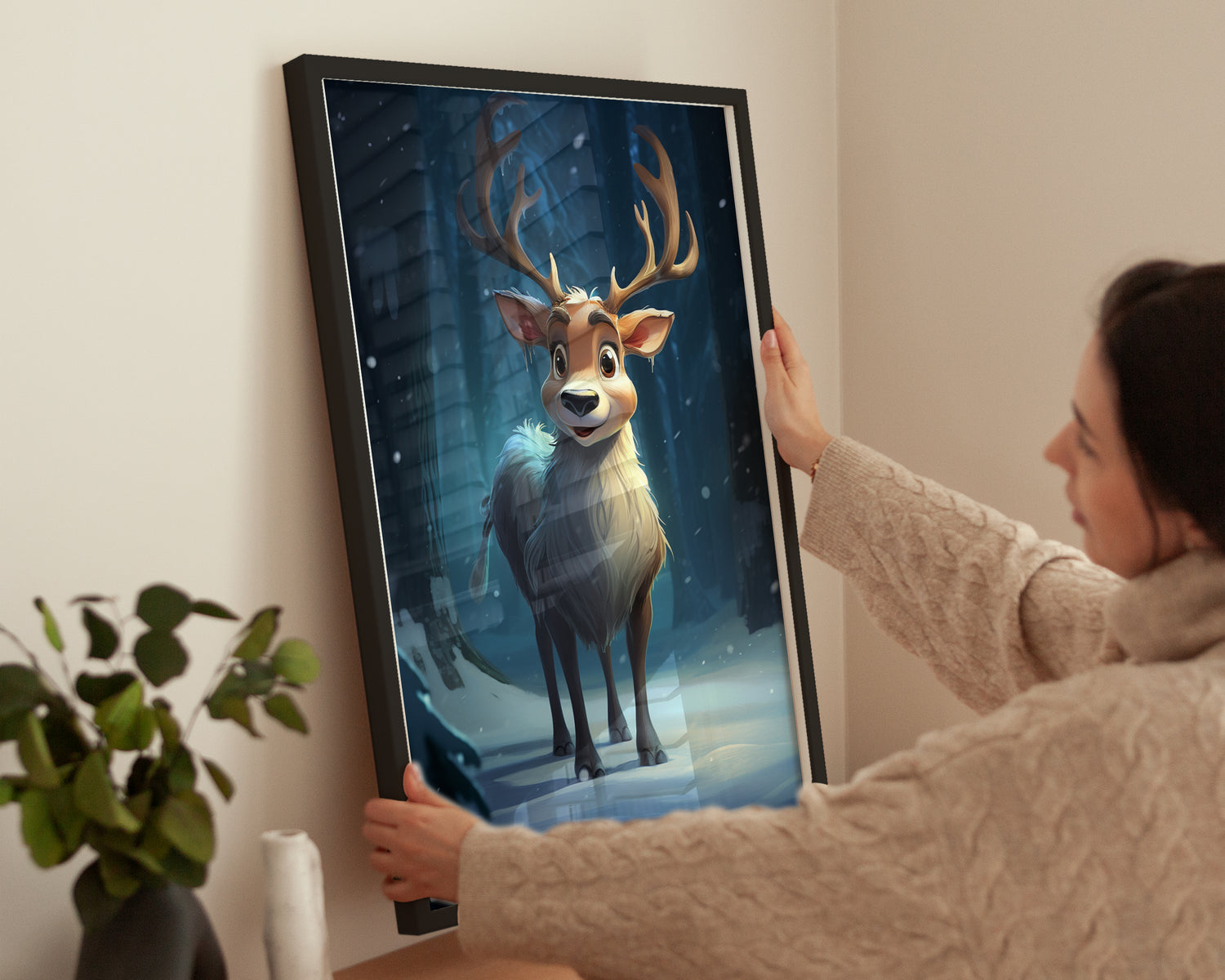 Dieses Poster zeigt ein fröhliches Cartoon-Rentier im verschneiten Winterwald. Mit großen, freundlichen Augen und verspieltem Ausdruck bringt es festliche Stimmung in den Raum. Ideal für Weihnachten, Kinderzimmer oder als humorvolle Winterdekoration. Die leuchtenden Farben und der detailreiche Hintergrund schaffen ein harmonisches Bild. Gedruckt auf mattem Premium-Papier überzeugt es durch brillante Farben und klare Konturen – perfekt für gemütliche Winteratmosphäre.
