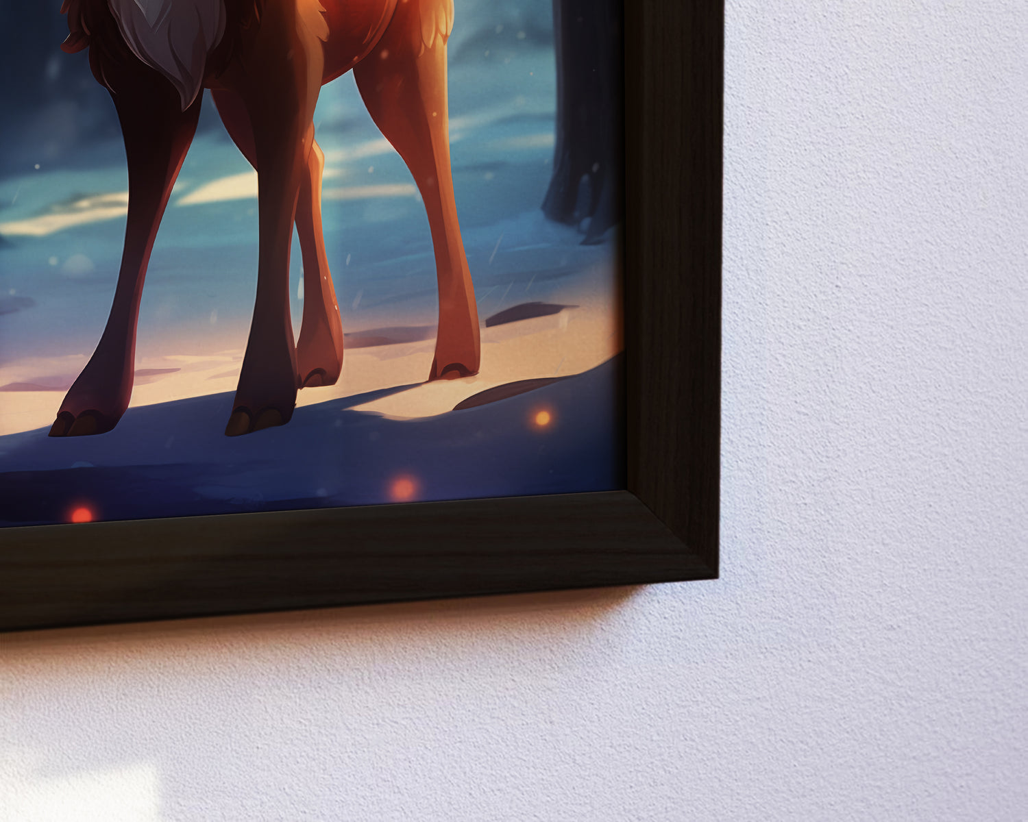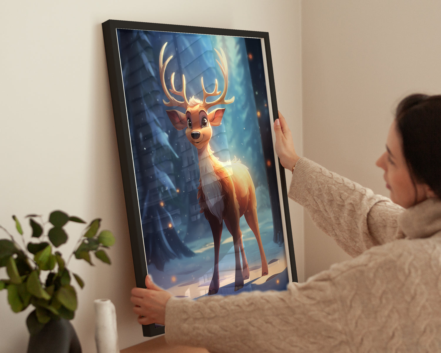 Dieses festliche Poster zeigt ein fröhliches Cartoon-Rentier im warmen, goldenen Licht eines verschneiten Winterwaldes. Weiche Lichtreflexe und kühle Schneetöne schaffen eine stimmungsvolle Atmosphäre, perfekt für die Weihnachtszeit. Ideal für Wohnzimmer, Kinderzimmer oder als saisonale Deko. Der Druck auf mattem Premium-Papier überzeugt mit brillanten Farben, feinen Details und einer einladenden Ausstrahlung, die Gemütlichkeit und festliche Stimmung ins Zuhause bringt.
