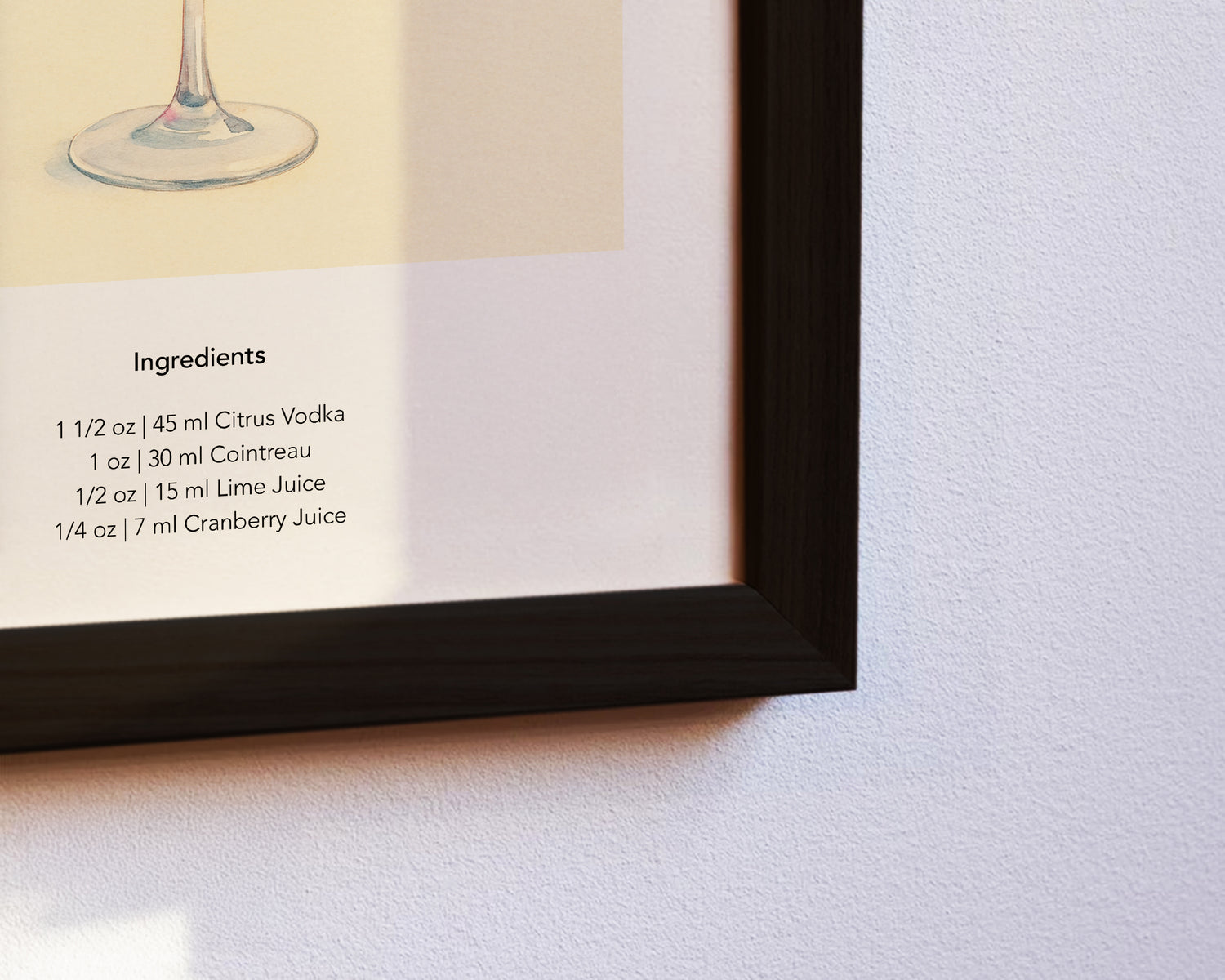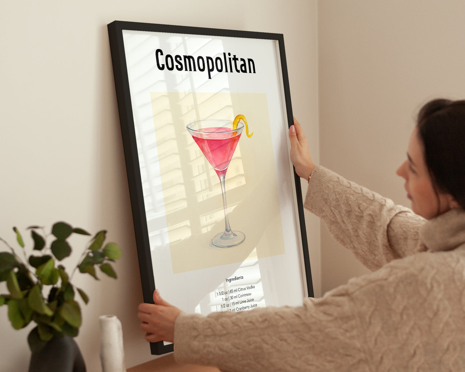 Das Poster zeigt ein elegantes Martiniglas mit pinkem Cosmopolitan und einer Zitronenzeste auf hellem Untergrund. Darunter sind die Zutaten in feiner Typografie aufgelistet, darunter Vodka, Cointreau, Limettensaft und Cranberrysaft. Die aquarellierte Darstellung vermittelt Leichtigkeit und modernen Stil. Ideale Dekoration für alle, die Cocktails und minimalistisches Design lieben.