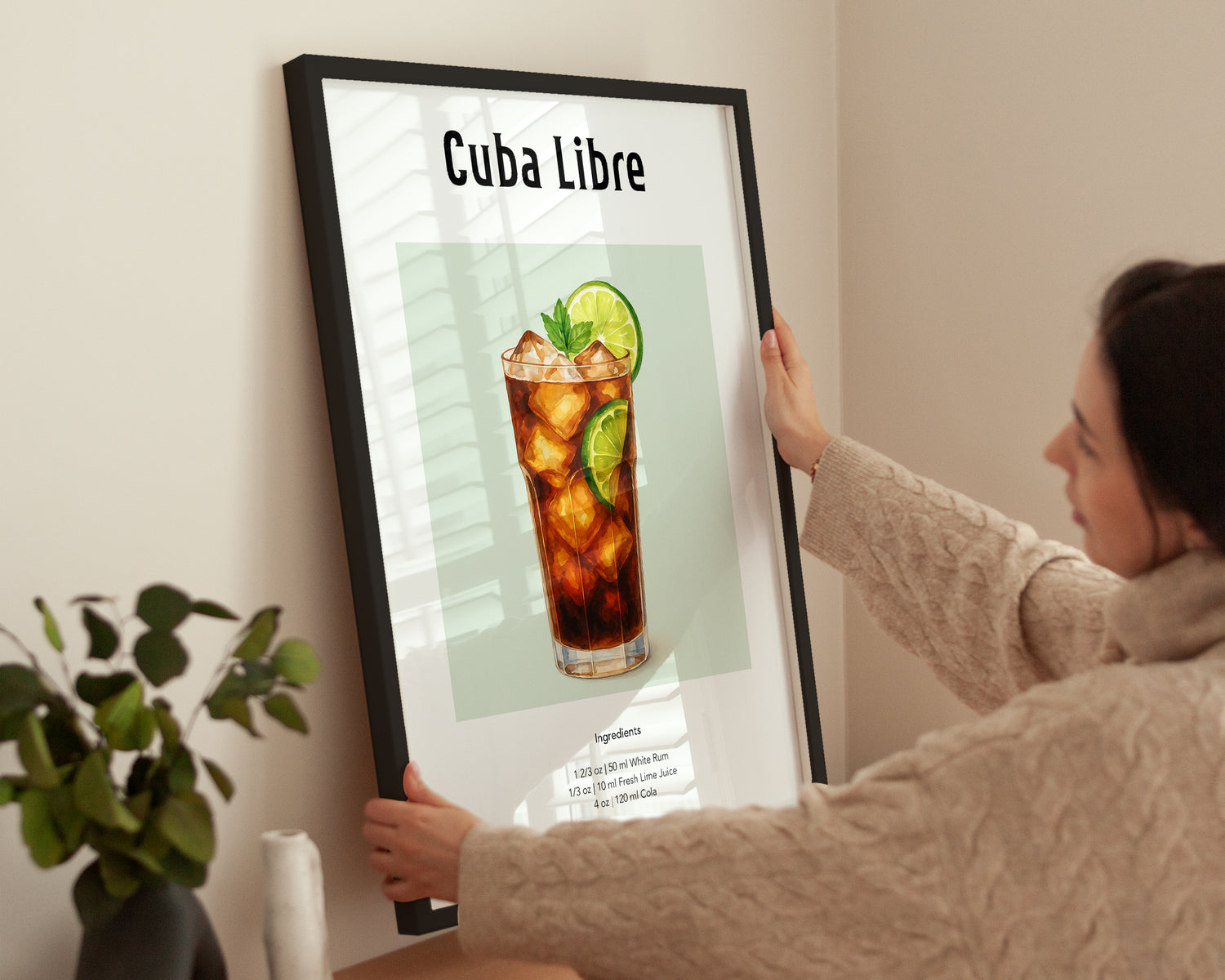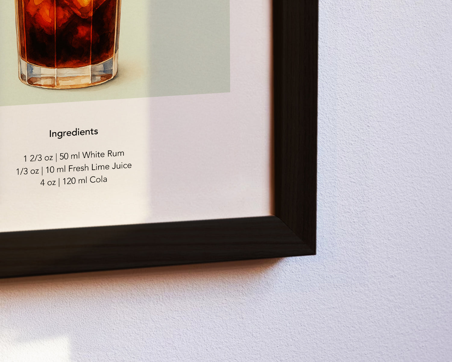 Das Cuba Libre Poster zeigt einen mit Eis gefüllten Longdrink mit Rum, Cola, Limettenscheiben und Minzblättern in realistischer Aquarelltechnik. Perfekt als dekorativer Hingucker für Cocktailbars, Küchen oder Wohnzimmer mit tropischem Flair.