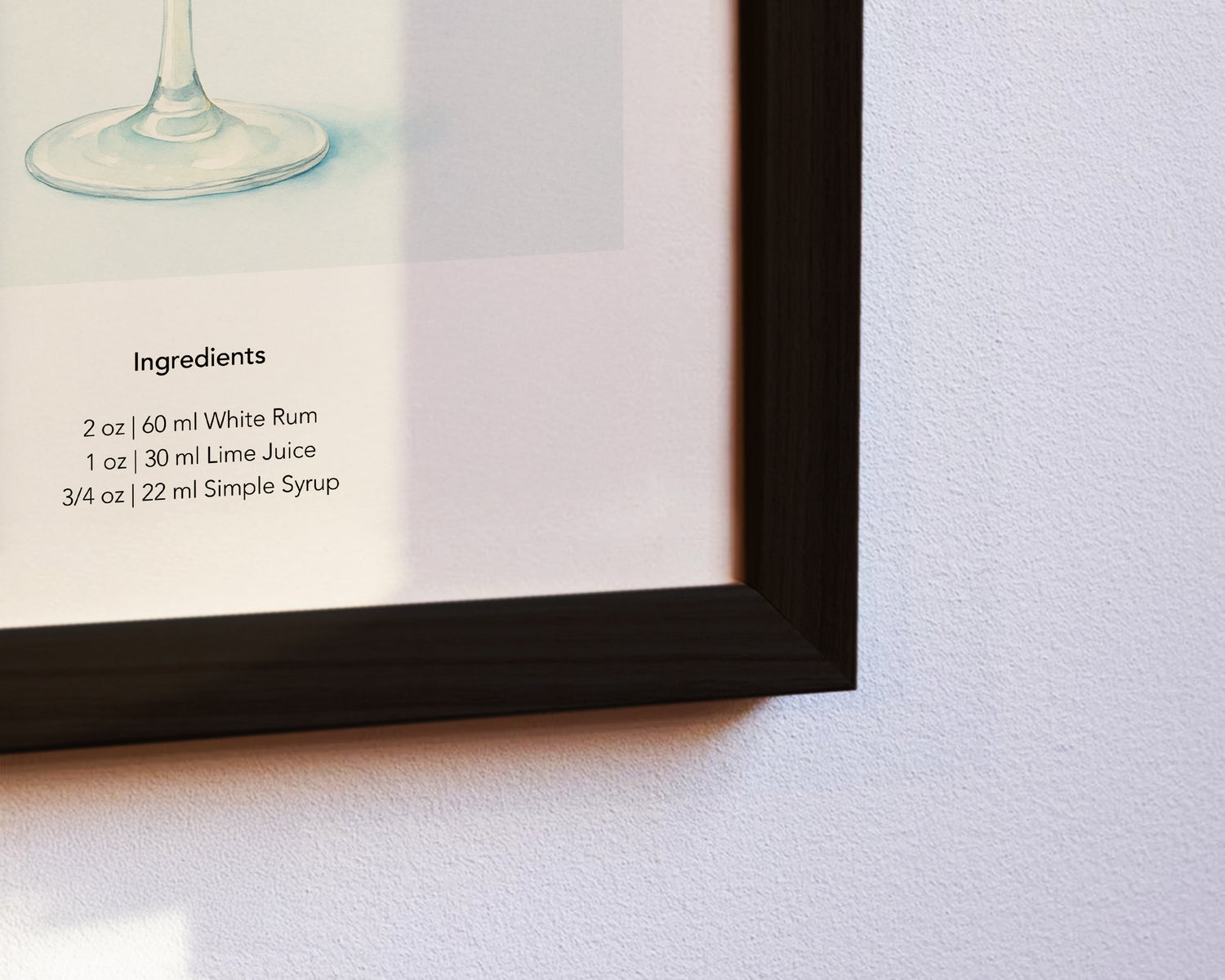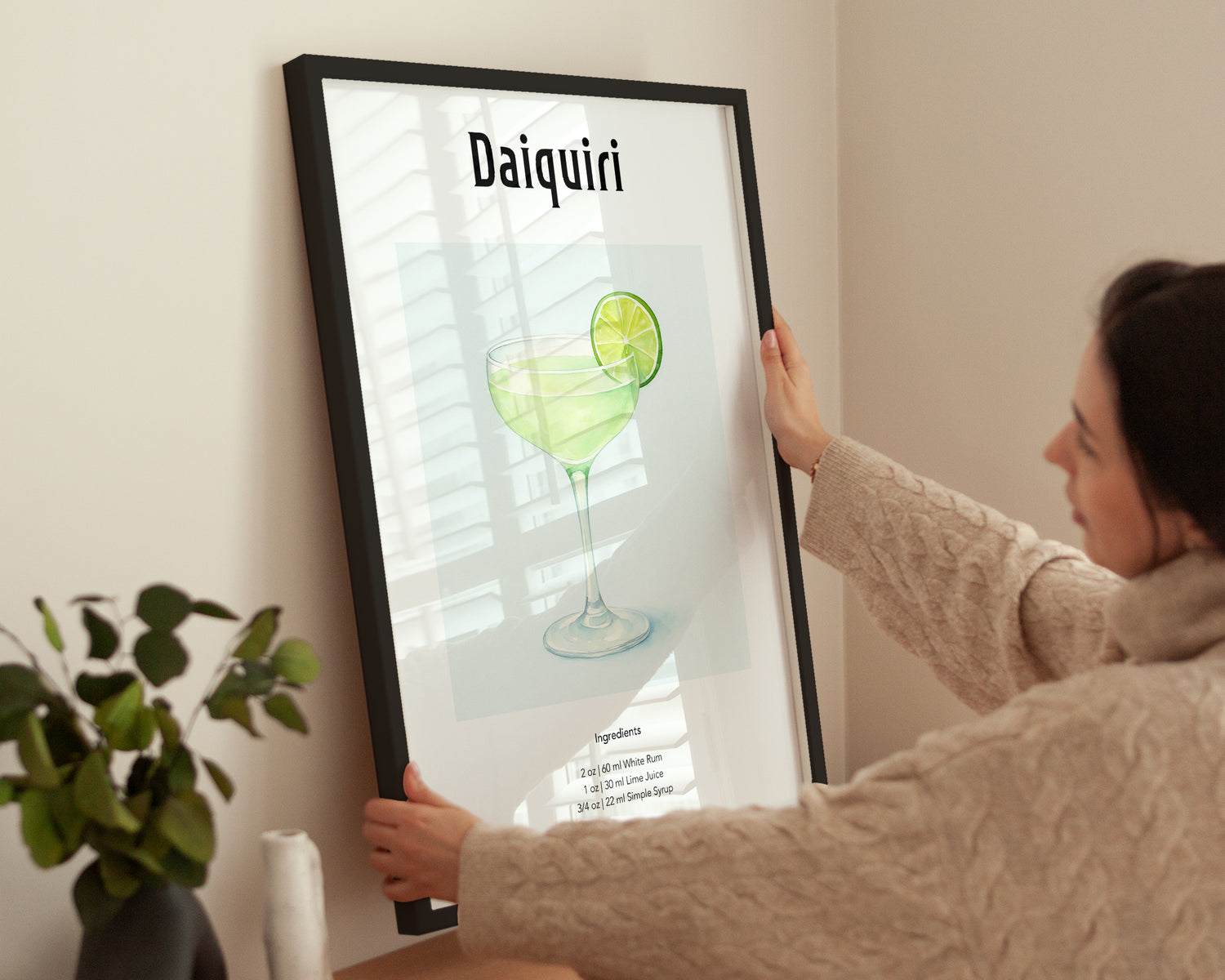 Das Poster zeigt ein elegantes Coupé-Glas mit einem grünen Daiquiri, garniert mit einer Limettenscheibe. Die Aquarelltechnik verleiht dem Bild eine frische, leichte Ausstrahlung. Perfekt für Küchen, Bars oder Essbereiche, die einen Hauch von Cocktail‑Chic wünschen.