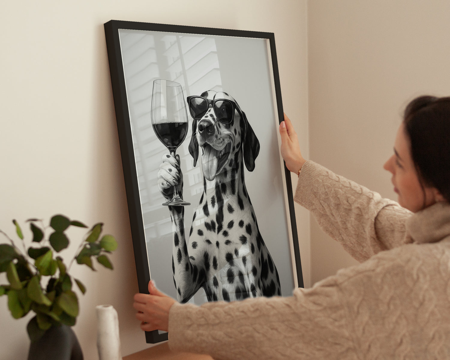 Dieses Poster zeigt einen gut gelaunten Dalmatiner mit Sonnenbrille, der lässig ein Glas Rotwein in der Pfote hält. Die realistische Schwarzweißdarstellung kombiniert Witz mit einem Hauch Eleganz. Das Motiv bringt sofort gute Laune und eignet sich perfekt als witzige Wanddeko für Tierliebhaber und Weinfreunde. Ein echtes Statement-Piece mit Augenzwinkern.