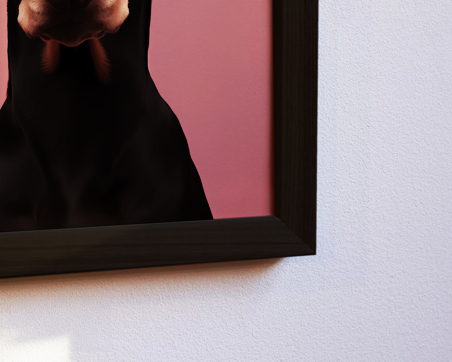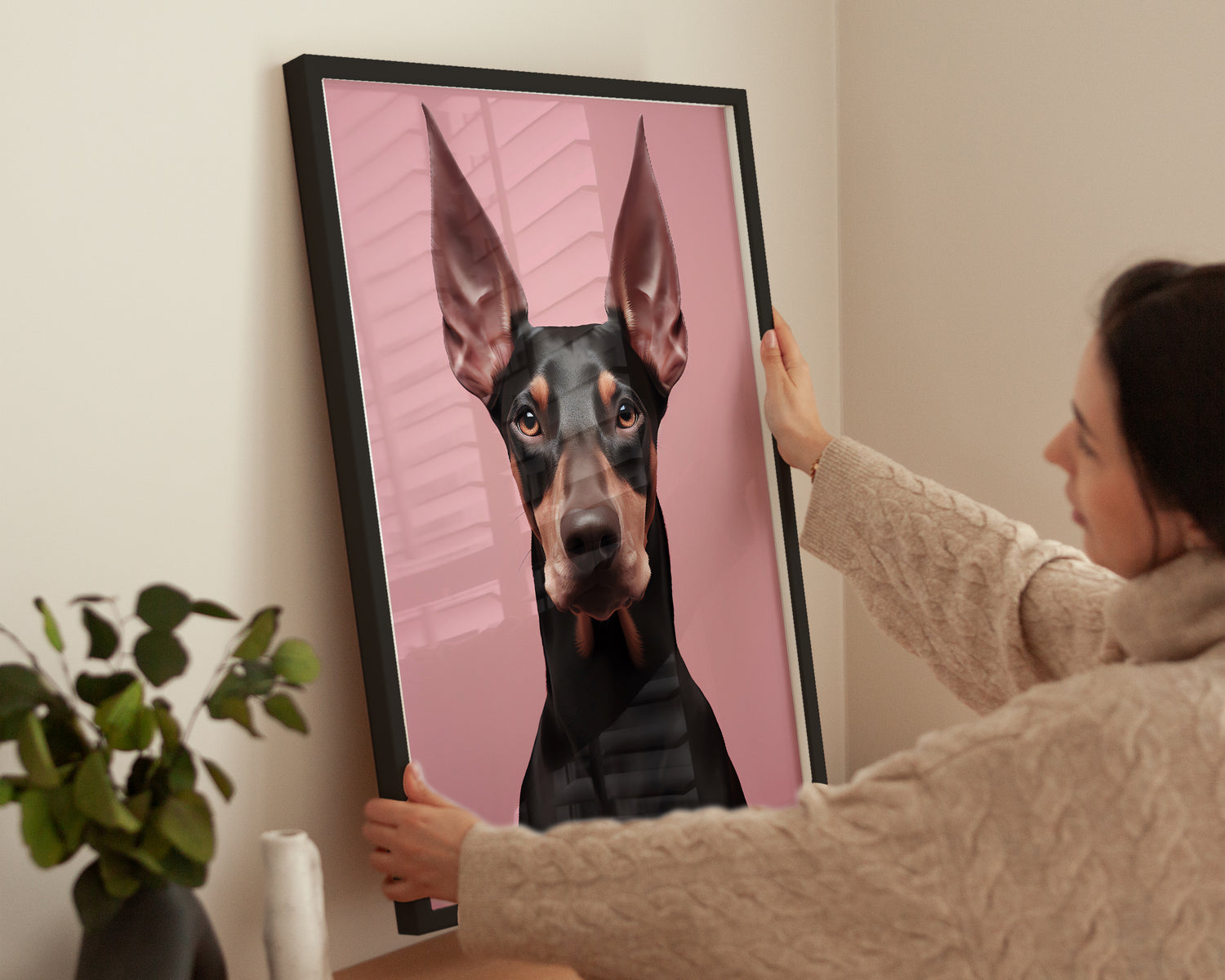 Dieses Poster zeigt den Kopf eines Dobermanns in frontaler Ansicht vor einem rosafarbenen Hintergrund. Die detailreiche Darstellung mit klarer Linienführung und intensiven Augen macht das Bild zu einem modernen Hingucker und einer charakterstarken Wanddekoration.