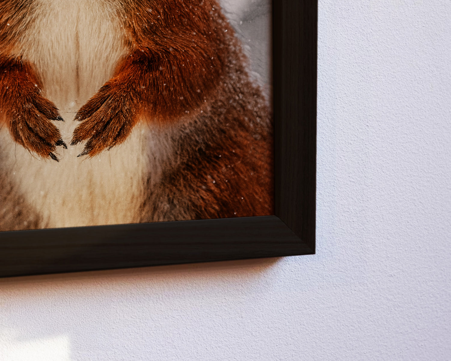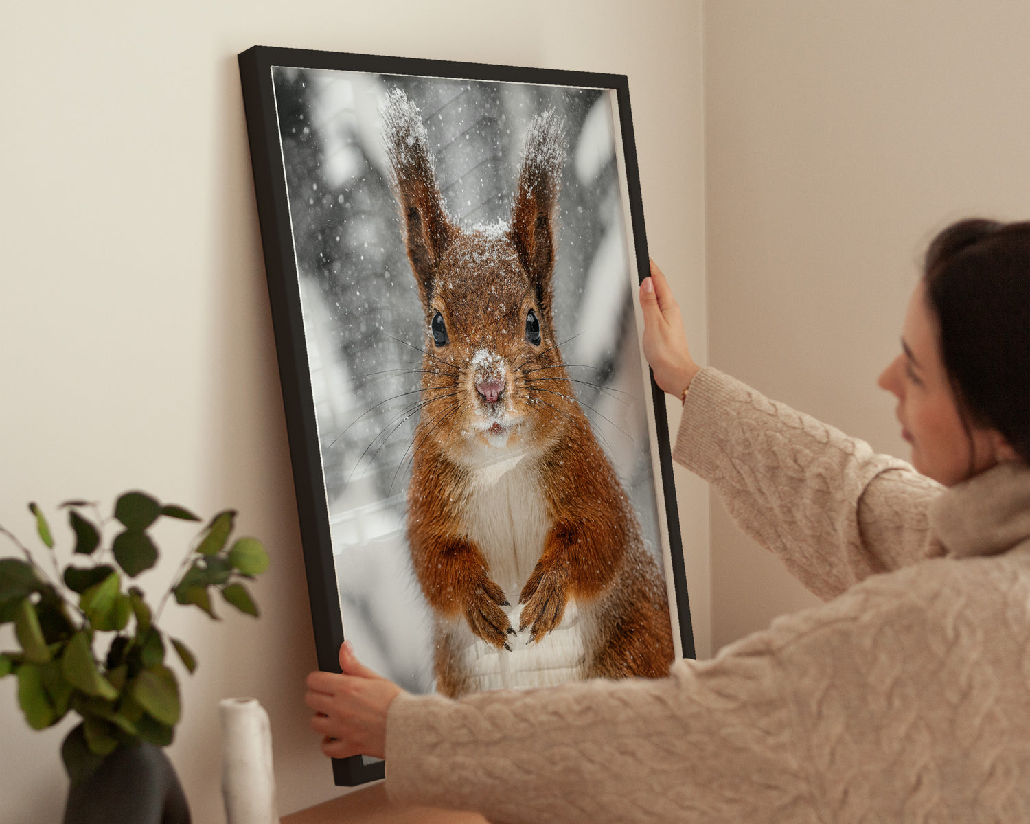 Dieses Poster zeigt ein rotes Eichhörnchen, das neugierig im Schnee sitzt. Das winterliche Tiermotiv strahlt Lebendigkeit und Natürlichkeit aus und ist ein verspielter Hingucker für gemütliche Wohnräume.