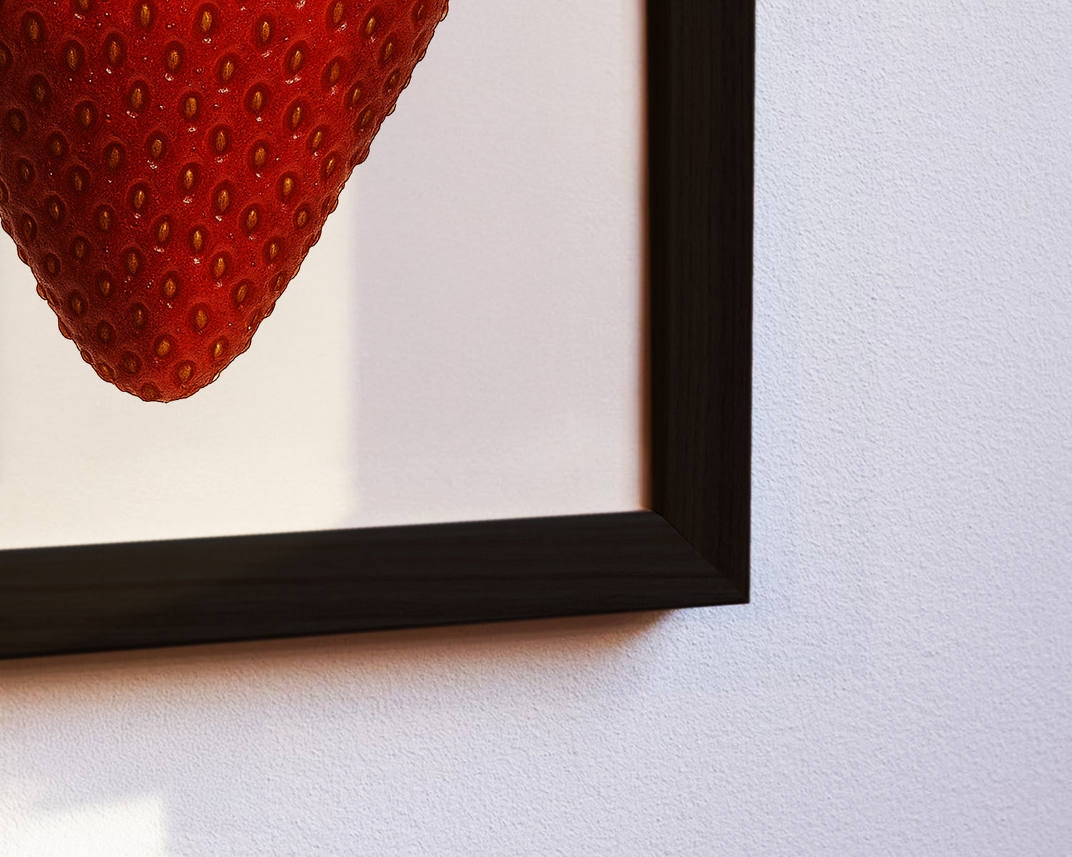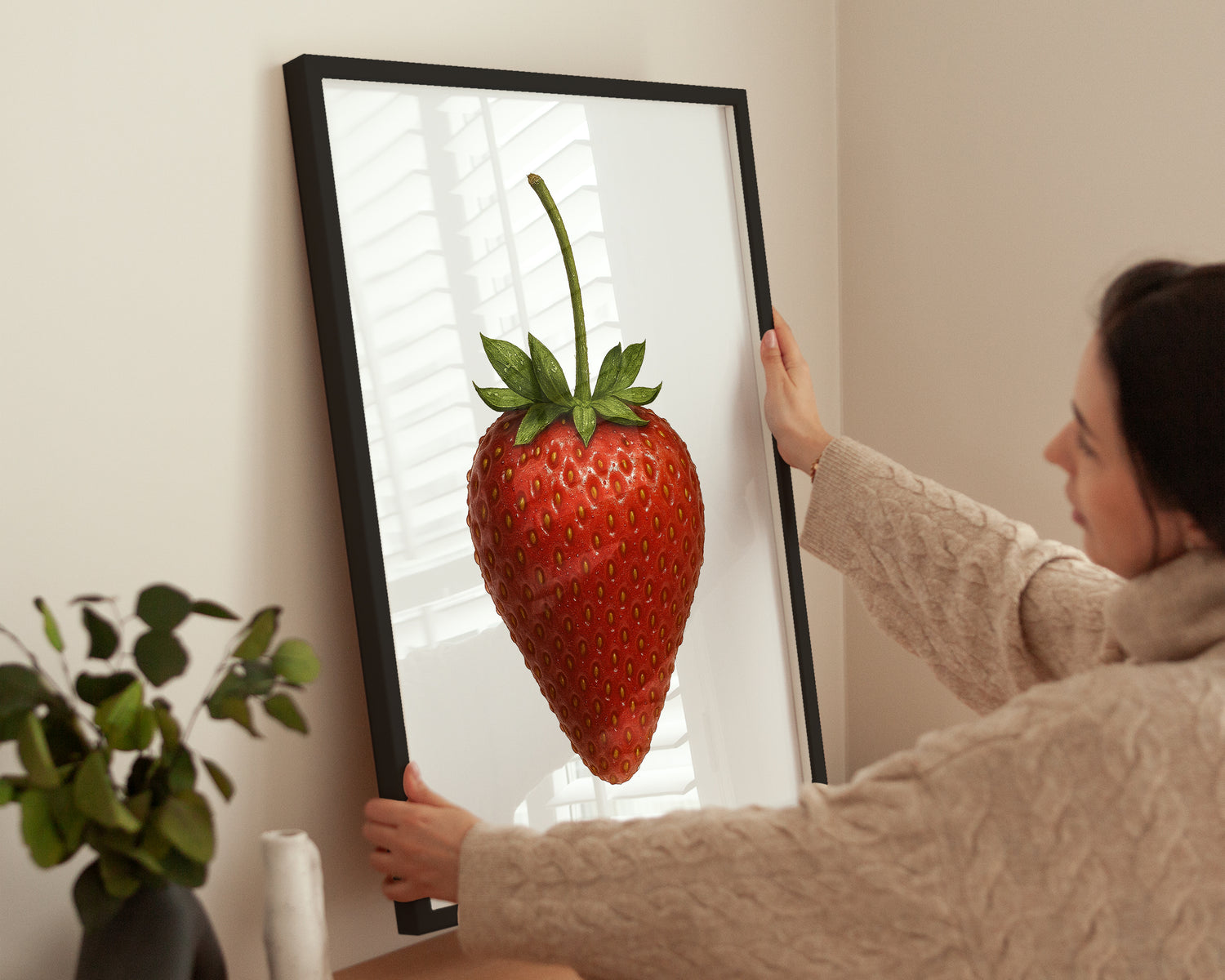 Dieses moderne Poster zeigt eine detailreiche, realistische Erdbeere in leuchtendem Rot auf weißem Hintergrund. Ideal für Küche, Esszimmer oder Wohnzimmer bringt das Kunstwerk frische Farben und sommerliche Akzente an deine Wand. Hochwertig gerahmt in Schwarz oder Weiß erhältlich.