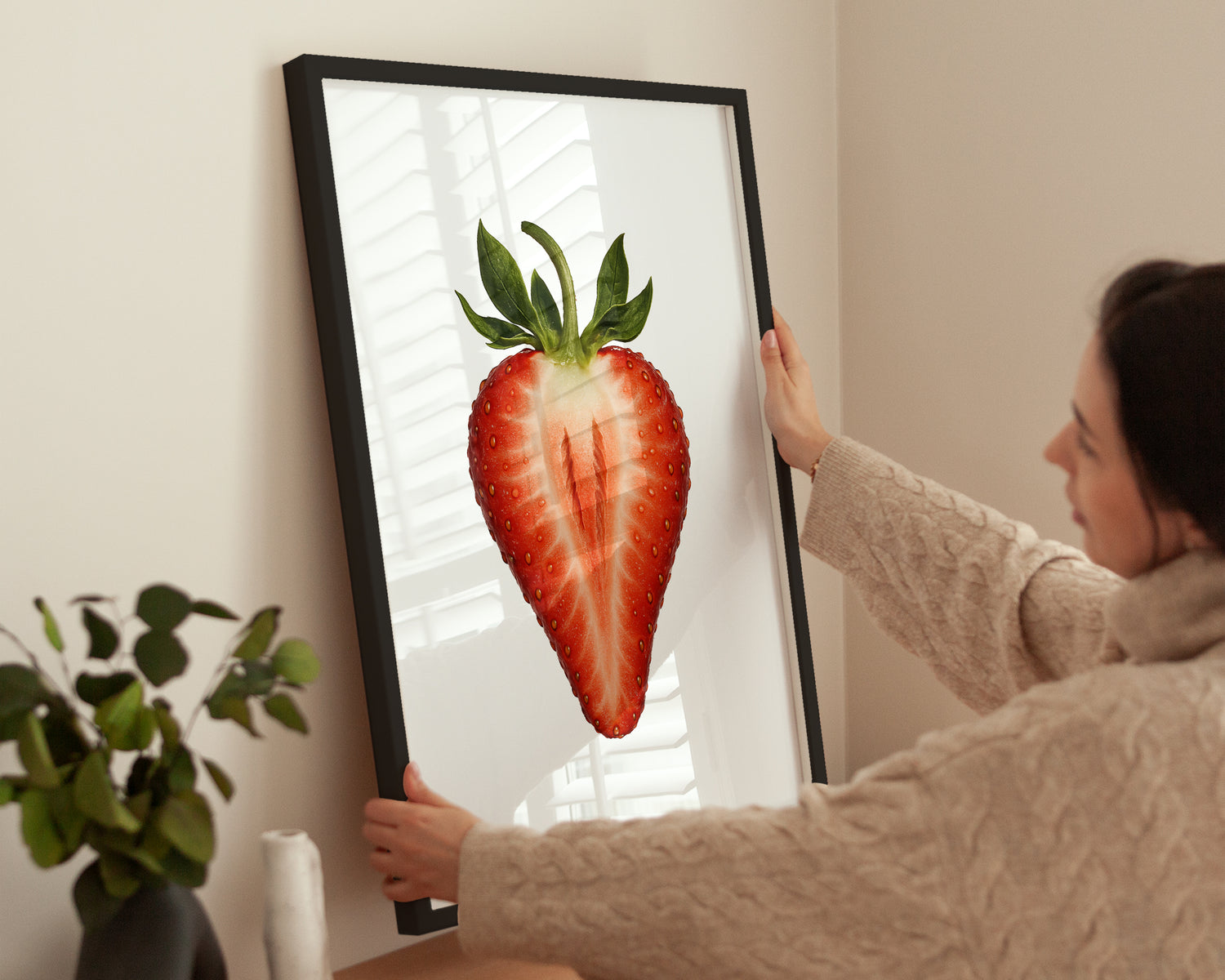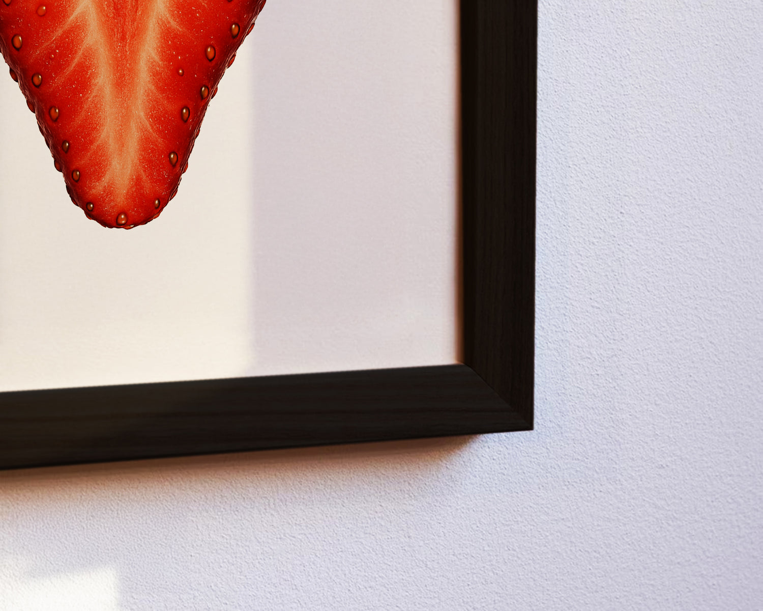 Dieses hochwertige Poster zeigt eine halbierte Erdbeere in feinen Details und bringt fruchtige Frische in dein Zuhause. Ideal für Küche, Esszimmer oder Wohnzimmer. Gerahmt in Schwarz oder Weiß.