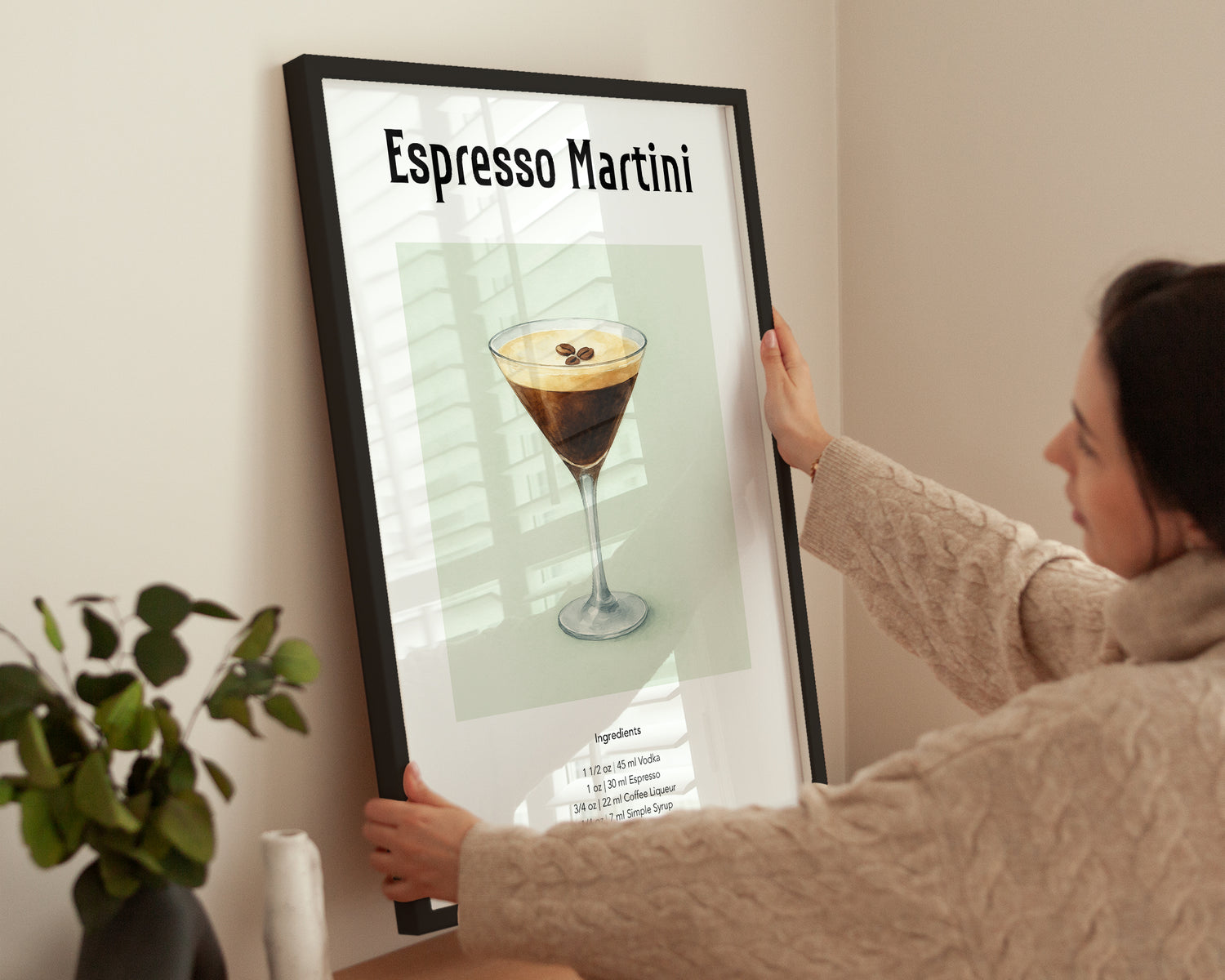 Das Poster zeigt ein Martini-Glas mit Espresso Martini, dekoriert mit drei schwebenden Kaffeebohnen auf der Crema. Die dezenten Aquarelltöne schaffen eine ruhige, zugleich luxuriöse Atmosphäre. Ideal für Wohnräume, Cafés oder Bars als edles Kunstwerk.