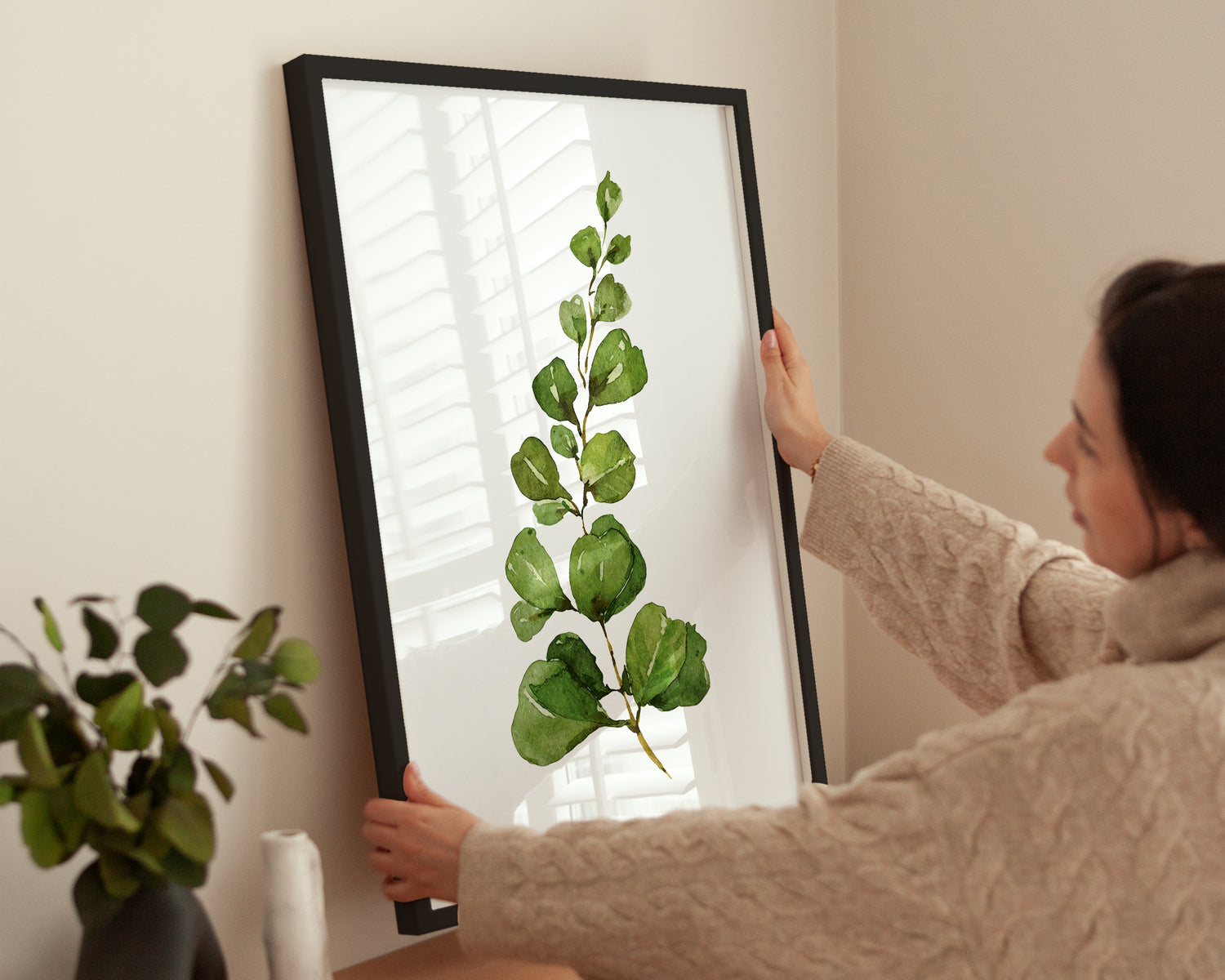 Der Posterprint zeigt einen filigranen Eukalyptuszweig, der in zarten Grüntönen und mit leichten Farbverläufen aquarelliert wurde. Die silbrig-grünen Blätter wirken luftig und harmonisch, während der weiße Hintergrund das Motiv klar in Szene setzt. Ideal für alle, die ihre Räume mit dezenten, botanischen Elementen aufwerten möchten. Die schlichte Eleganz fügt sich nahtlos in skandinavisch inspirierte Einrichtungsstile ein.