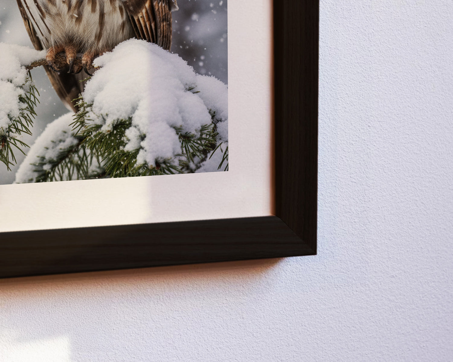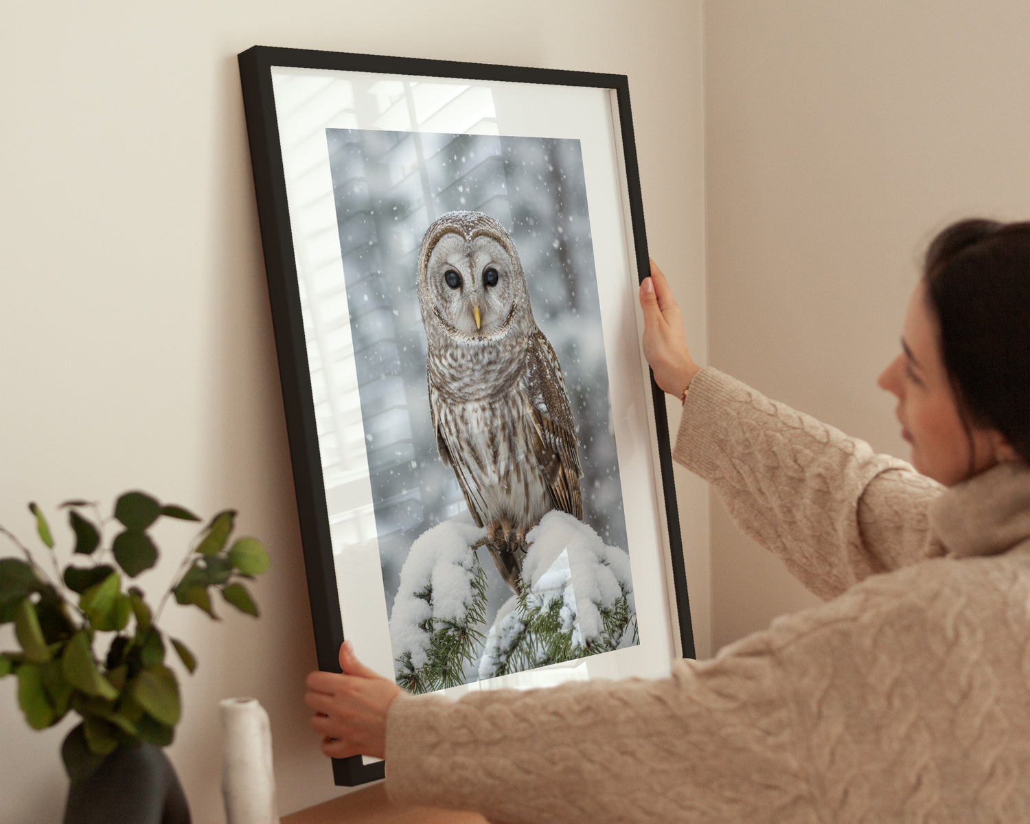 Poster mit einer Eule, die im Schneegestöber auf einem Ast sitzt. Ein ruhiges und mystisches Wintermotiv, das Harmonie und Eleganz vermittelt.