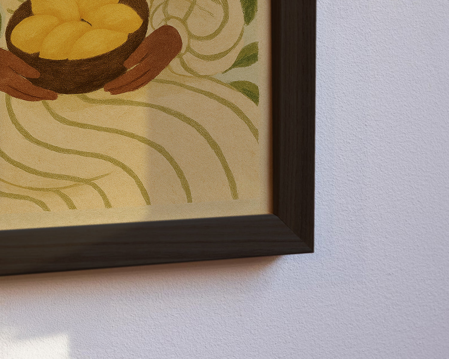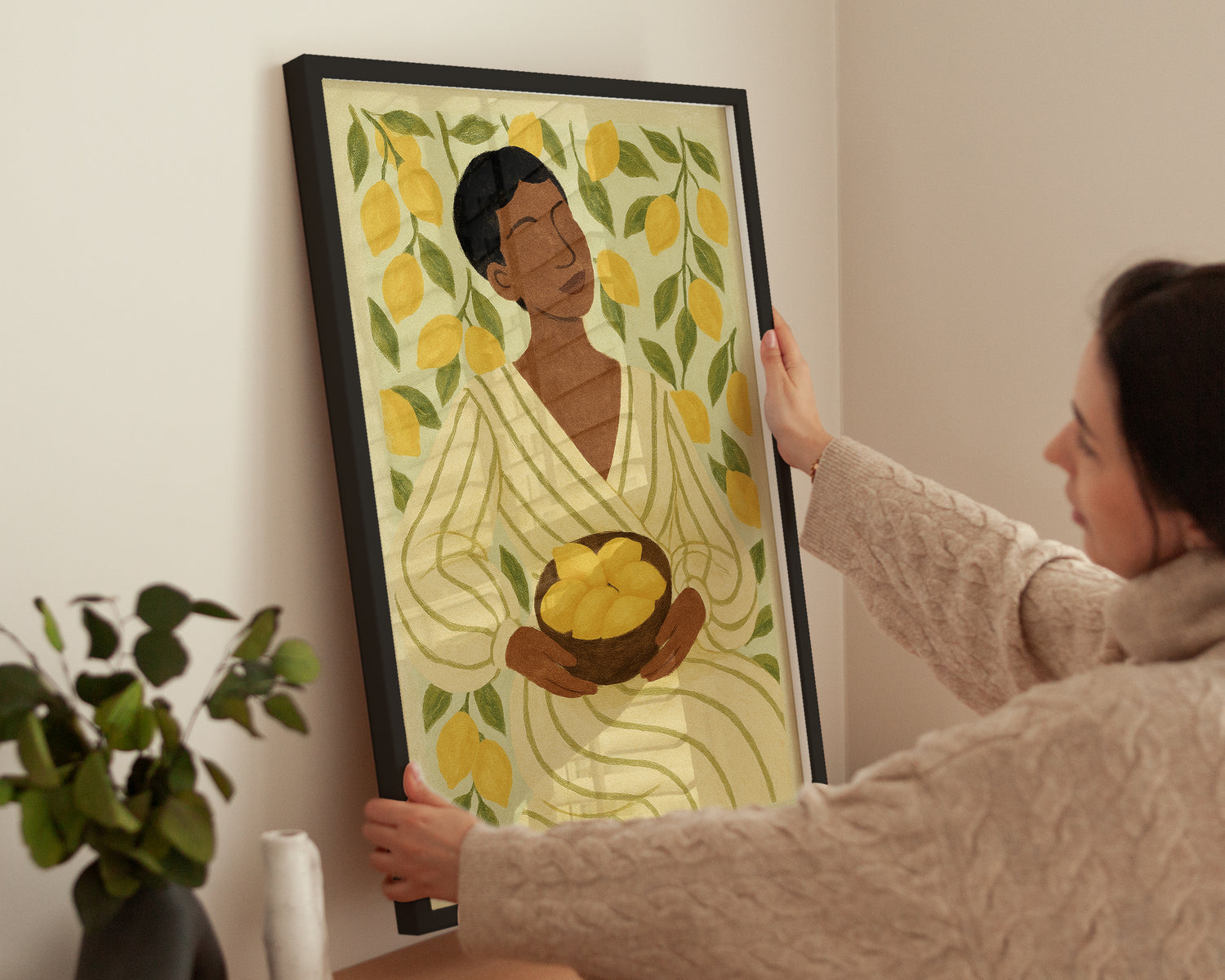 Dieses moderne Poster zeigt eine stilvolle Illustration einer Frau mit einer Schale voller Zitronen, umgeben von satten Zitronenzweigen. Die mediterrane Farbwelt in Gelb- und Grüntönen bringt sonnige Leichtigkeit in dein Zuhause und macht das Wandbild zum Highlight in Küche, Wohnzimmer oder Esszimmer. Perfekt für alle, die moderne Illustrationen und mediterrane Wanddeko lieben.