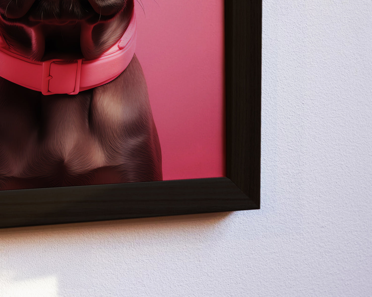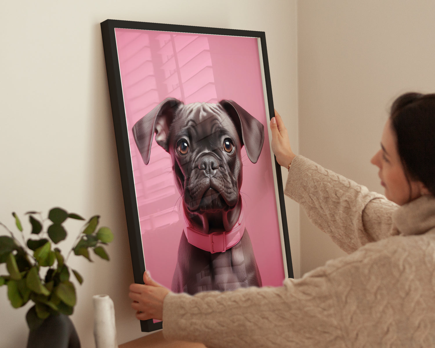 Eine niedliche French Bulldog sitzt vor einem sanft rosa Hintergrund und blickt mit großen dunklen Augen treu in die Kamera. Das moderne Tiermotiv überzeugt durch minimalistische Farbgebung und bringt eine liebevolle Atmosphäre in jeden Raum.
