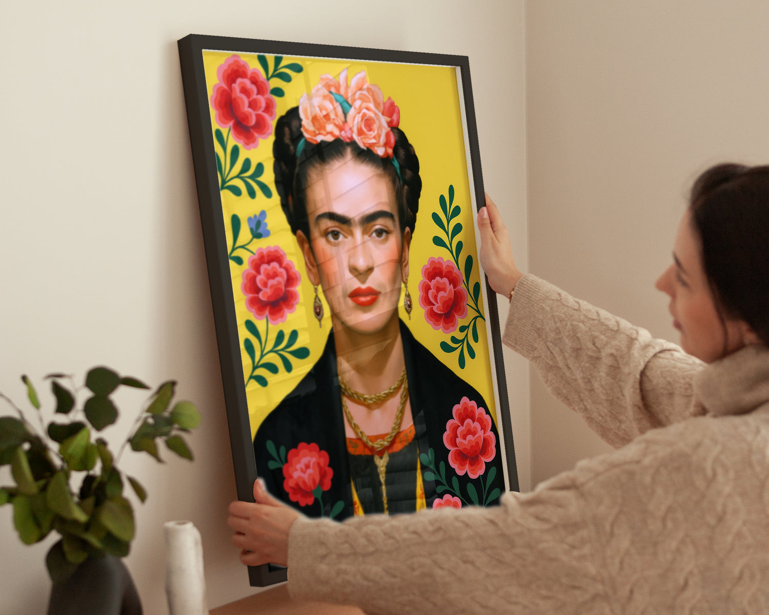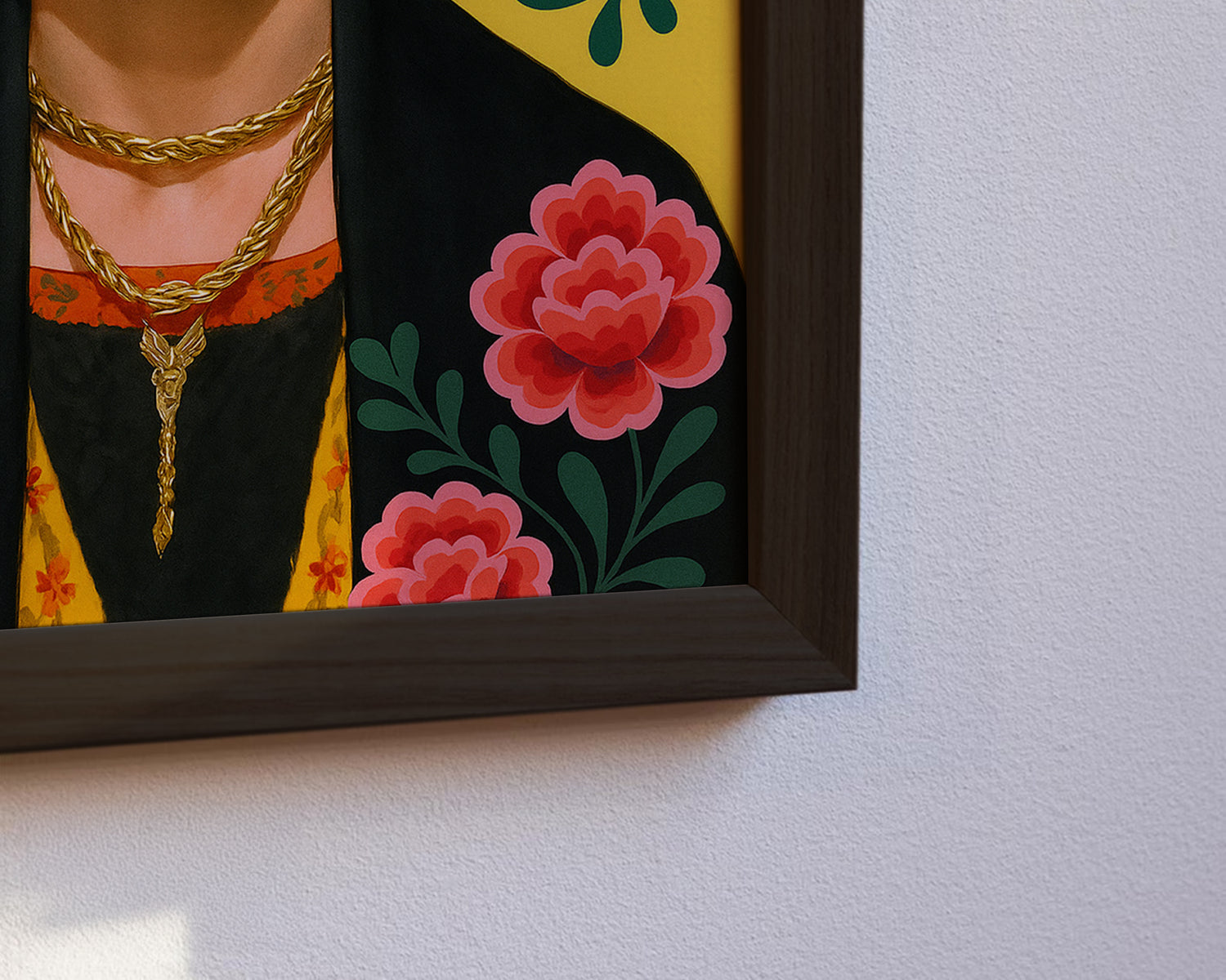 Dieser brillante Kunstdruck zeigt Frida Kahlo vor einem sonnigen gelben Hintergrund, umgeben von leuchtenden Rosen. Das Bild vereint mexikanische Kunsttradition mit modernem Boho-Stil und ist ein einzigartiges Highlight für Wohnzimmer, Schlafzimmer oder Flur. Ideal für Kunstliebhaber, die ihrem Zuhause mit einem Frida Kahlo Wandbild Charakter und farbenfrohe Lebensfreude verleihen wollen.