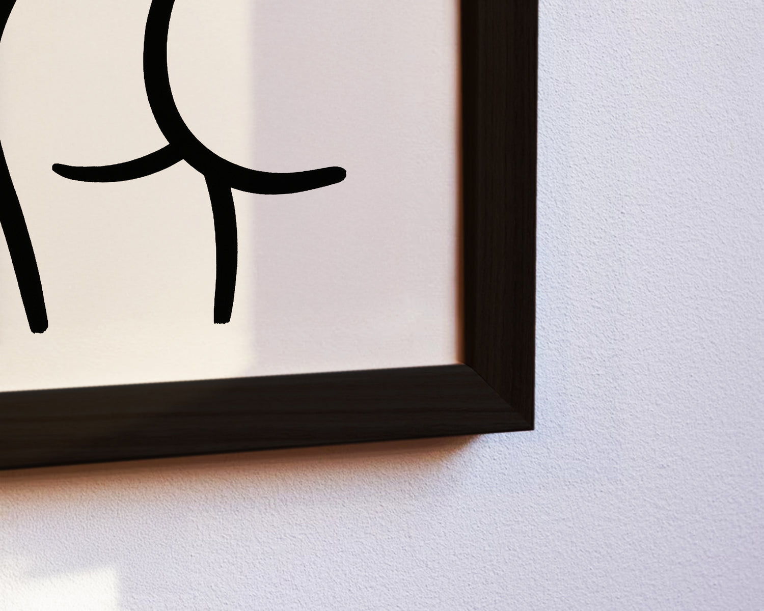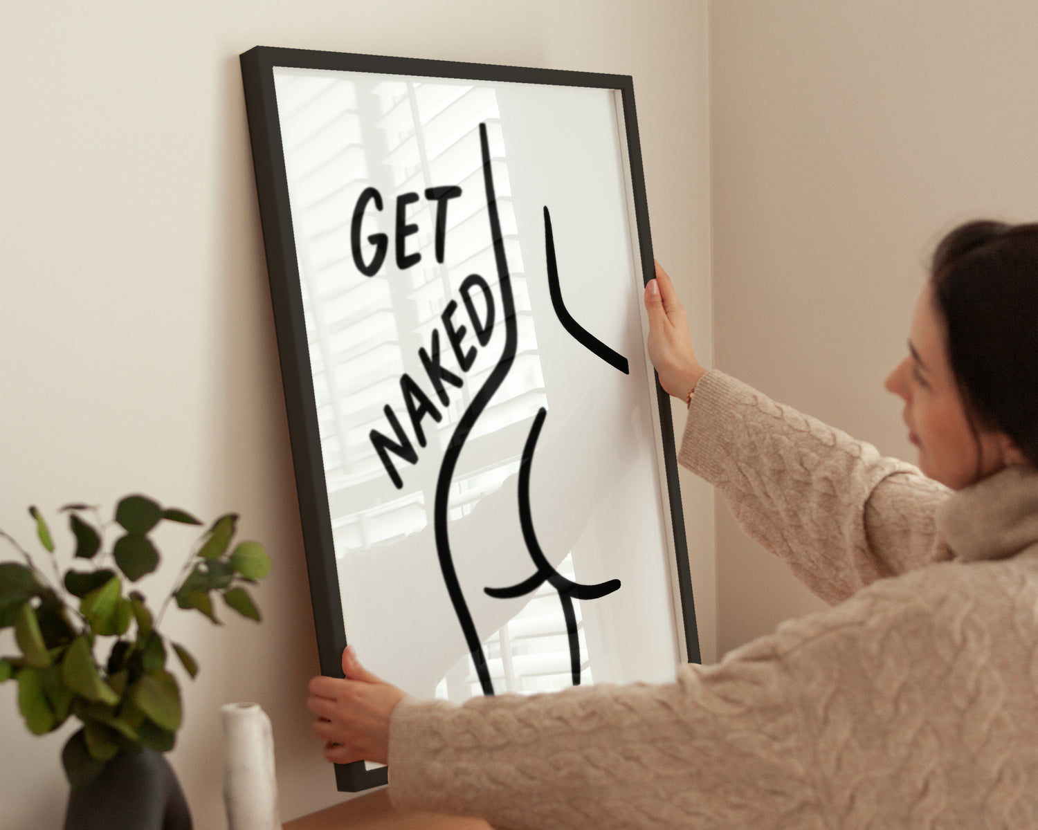 Dieses minimalistische Schwarz-Weiß Poster zeigt einen nackten Rücken mit Po in einer eleganten Line Art Zeichnung und den frechen Schriftzug „Get Naked“. Perfekt für Badezimmer, Gäste-WCs oder als stylishe Deko im Schlafzimmer. Modern, witzig und ein echter Blickfang.
