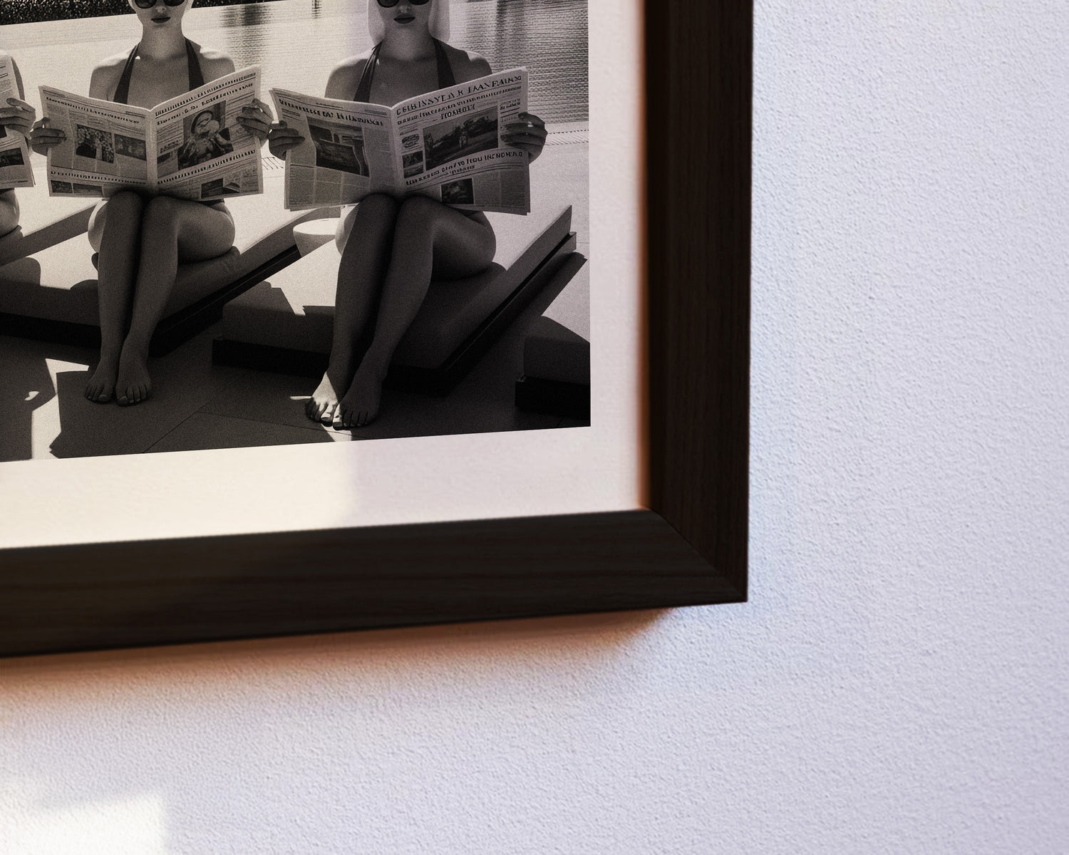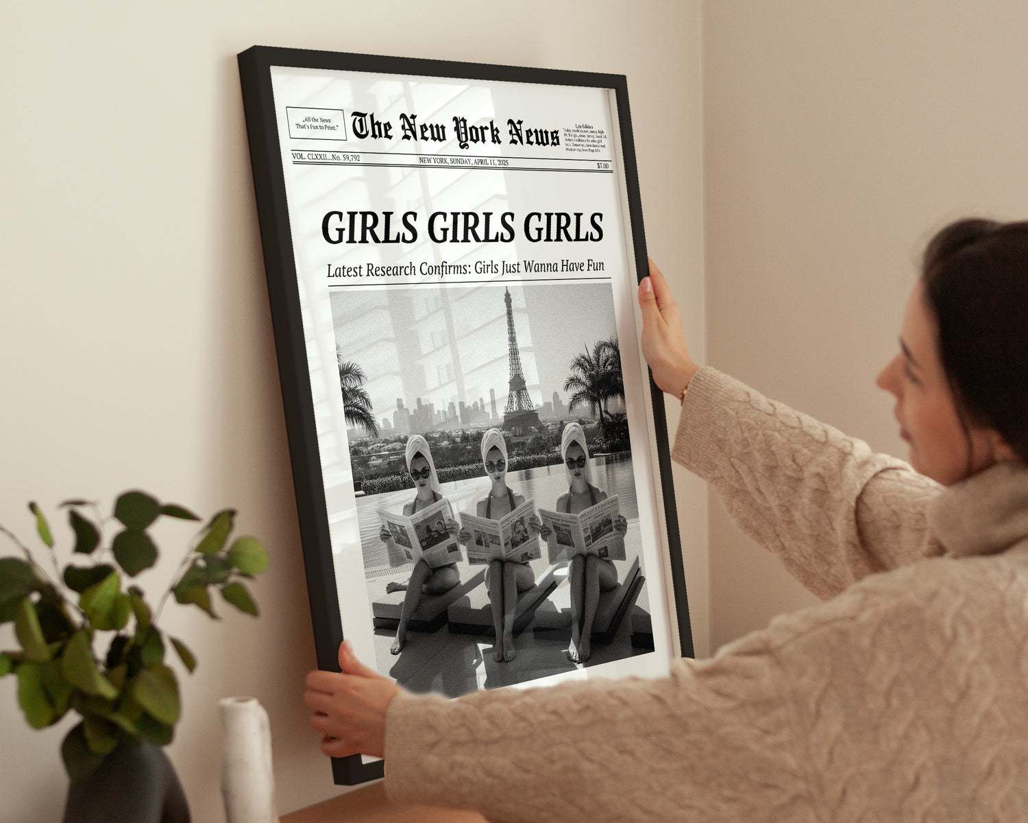 Im Zeitungsdesign gehaltenes Poster mit drei Frauen am Pool vor Eiffelturm-Skyline. Die Schlagzeile Girls Just Wanna Have Fun macht das Motiv zu einem femininen Statement. Ideal für moderne Galeriewände und urbane Wohnstile.