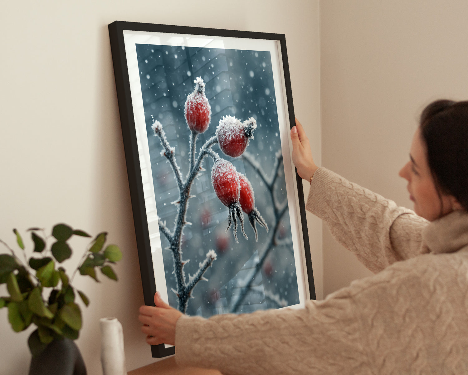Dieses Poster zeigt gefrorene Hagebutten in kräftigem Rot, die von Frost und Schnee überzogen sind. Ein kontrastreiches Naturmotiv, das winterliche Eleganz und frische Akzente in deine Einrichtung bringt.