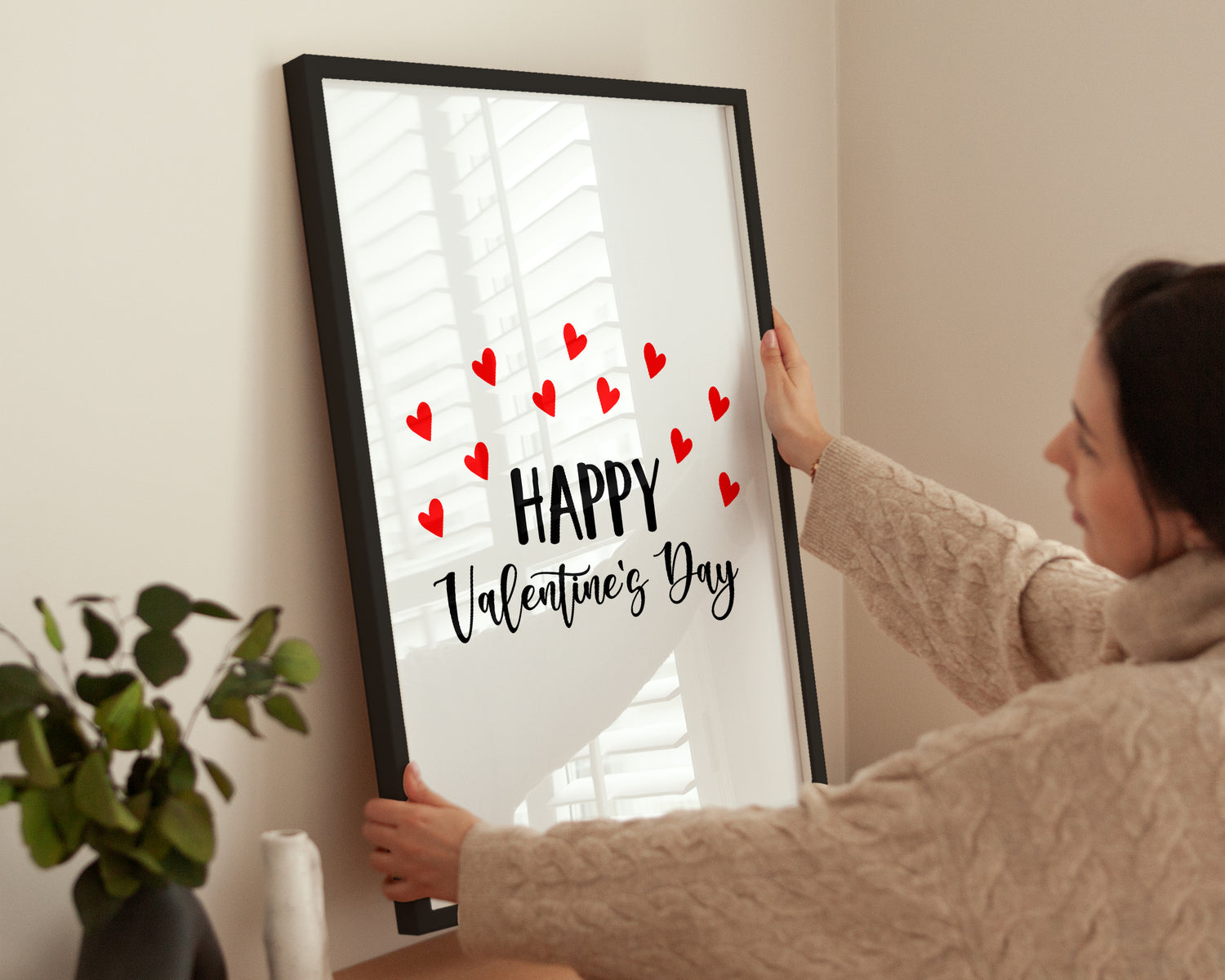 Dieses Poster zeigt in eleganter Typografie die Worte Happy Valentine’s Day, umrahmt von vielen kleinen roten Herzen, die verspielt über die Fläche tanzen. Die Kombination aus schwungvoller und klarer Schrift wirkt modern und gleichzeitig romantisch. Perfekt geeignet, um das Schlafzimmer, Wohnzimmer oder sogar den Eingangsbereich in eine liebevolle Atmosphäre zu tauchen. Dieses Motiv bringt Freude und zeigt auf charmante Weise Zuneigung – nicht nur am Valentinstag.