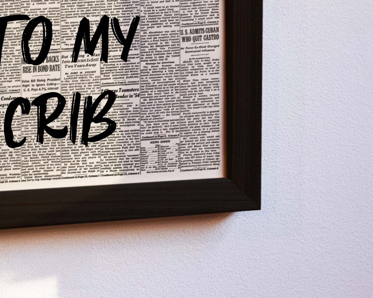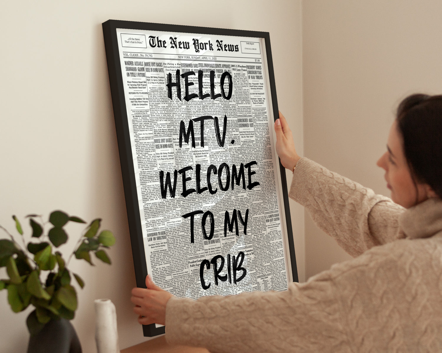 Schwarz-weißes Poster im Zeitungsdesign mit dem ikonischen Spruch Hello MTV, Welcome To My Crib. Das künstlerische Graffiti-Lettering in Schwarz macht das Motiv zum modernen Statement-Piece. Ideal für urbane Wohnräume, Lofts oder trendige Bilderwände.