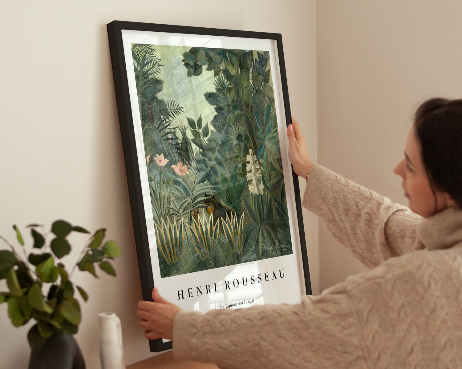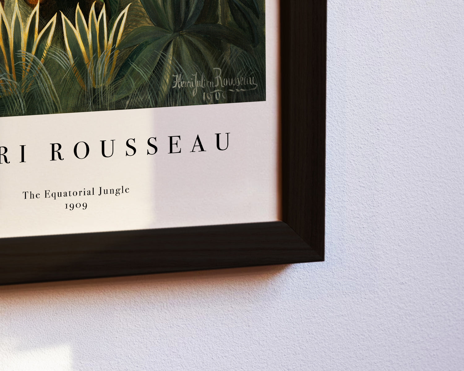 Henri Rousseau Gemälde: „The Equatorial Jungle“ (1909), ein Werk des Naiver Primitivismus. Ursprünglich von Henri Rousseau gemalt. Entdecke mehr von seiner Kunst in unserer Kategorie Berühmte Kunstwerke. Künstler: Henri Rousseau