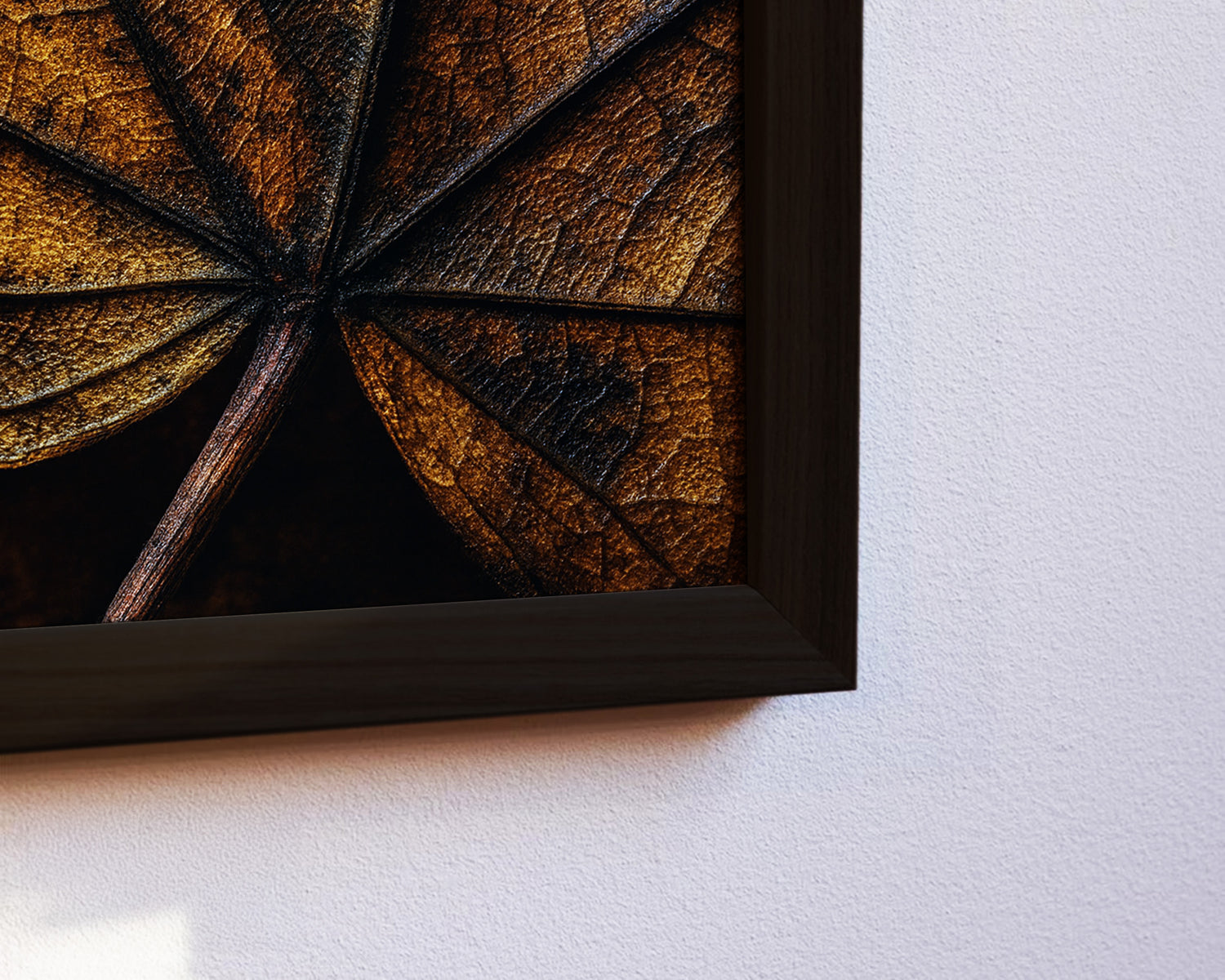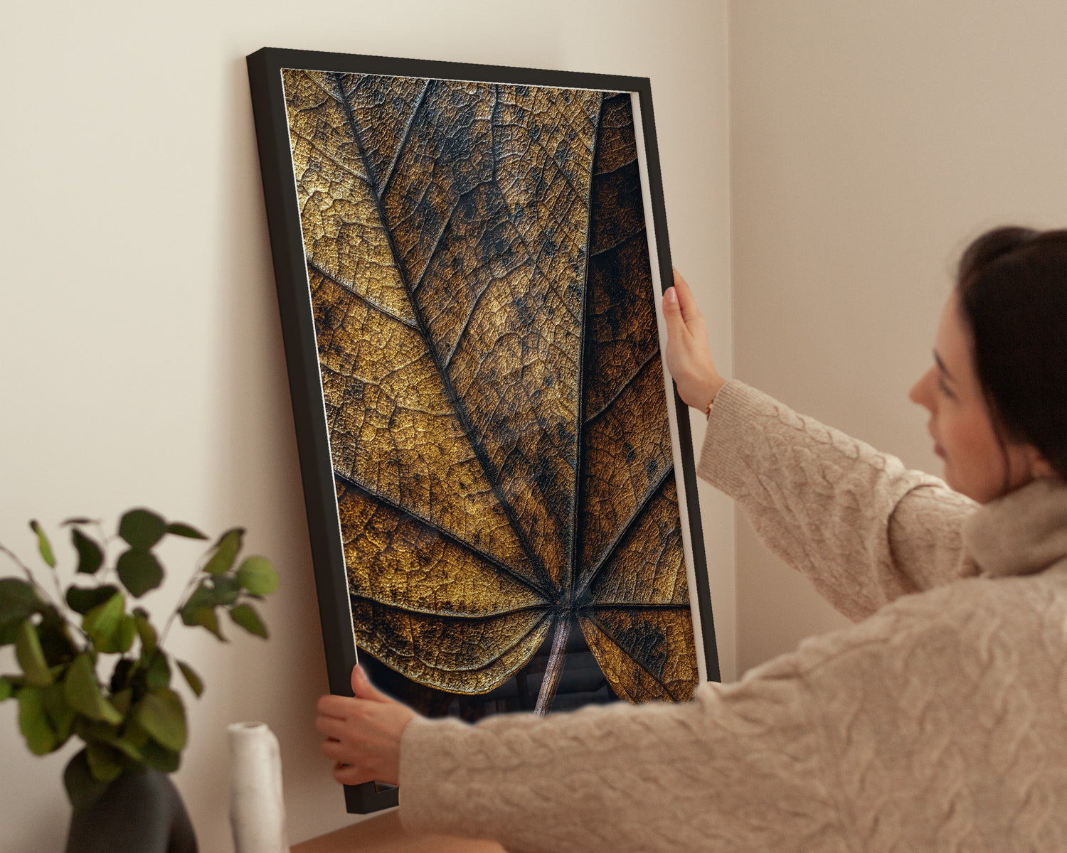 Detailreiches Poster mit einer Makroaufnahme eines herbstlichen Blattes. Die sichtbare Blattstruktur und warmen Farbtöne machen es zu einem modernen, naturinspirierten Wandbild.
