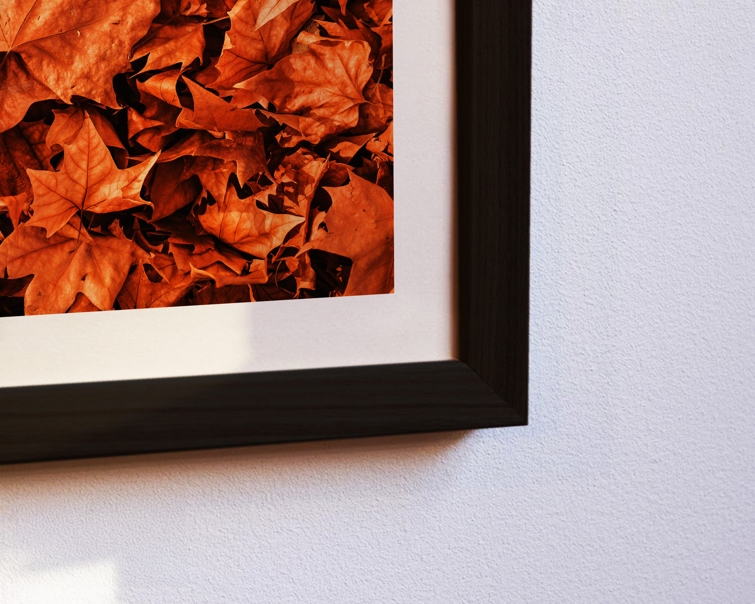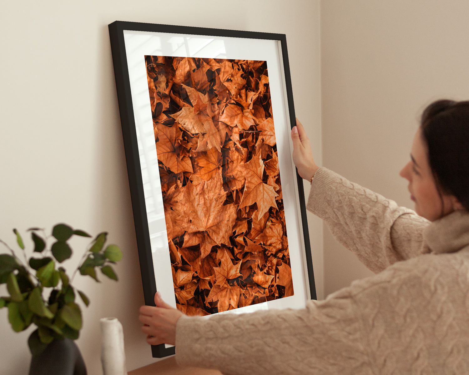 Dieses Poster zeigt eine Fülle von herabgefallenen Herbstblättern in warmen Orangetönen. Das naturverbundene Motiv bringt Gemütlichkeit und die Farbenvielfalt des Herbstes direkt an deine Wand.