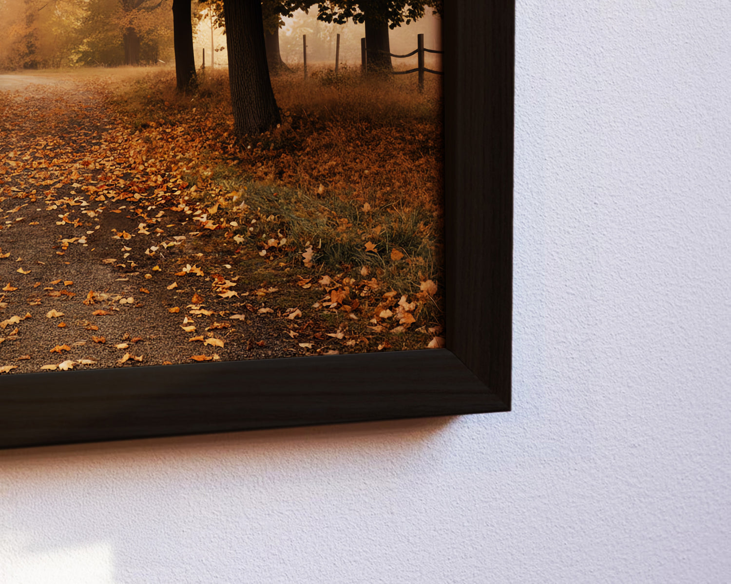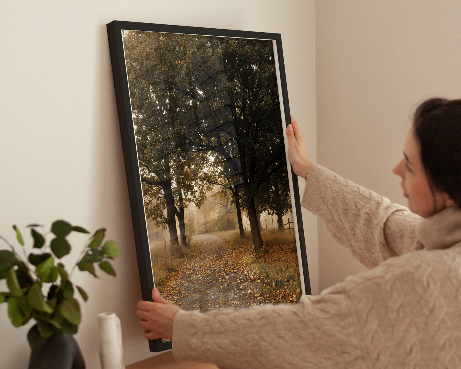 Dieses Poster zeigt eine idyllische Landstraße, die von herbstlichen Bäumen gesäumt wird. Das warme Naturmotiv vermittelt Geborgenheit und ist ideal für eine gemütliche, saisonale Wandgestaltung.